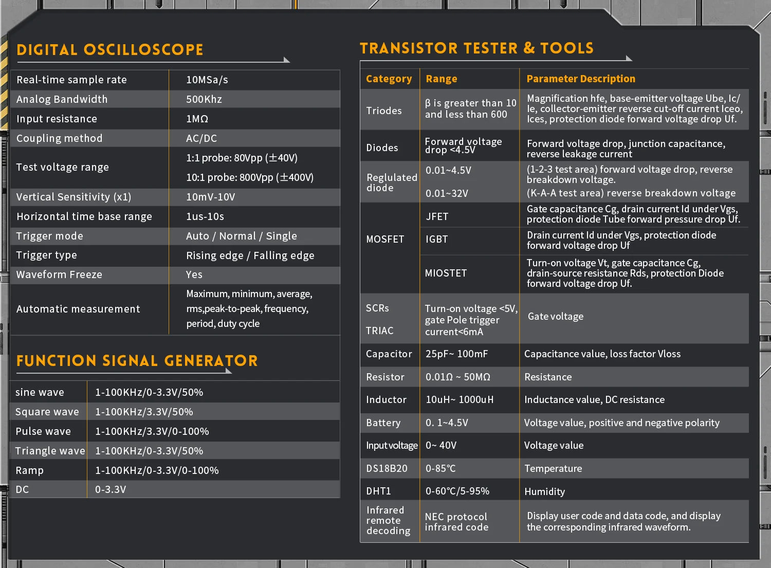 FNIRSI DSO-TC3 is an upgraded version of DSO-TC2. On the basis of DSO-TC2, it has upgraded capacitance ESR detection, function signal source output, Electronic measuring instrument bandwidth and sampling rate improvement, input voltage and diode detection range increase and so on. The improvement in performance and function of DSO-TC3 makes the device more stable and accurate in the detection process