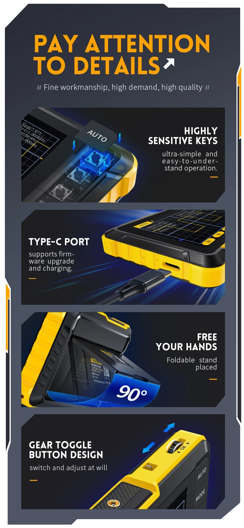 The oscilloscope has a real-time sampling rate of 2.5MS/s, abandwidth of 200KHz, and complete trigger functions (single, normal, and automatic).