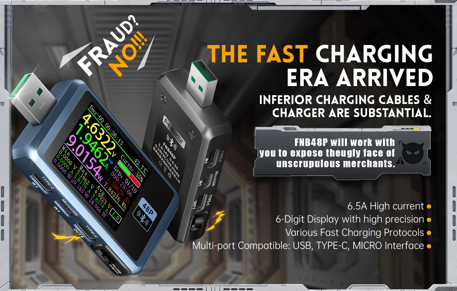 FNIRSI-FNB48P Ammeter Voltmeter USB Tester TYPE-C Fast Charge Detection Trigger Capacity Ripple Measurement with CNC Metal Shell