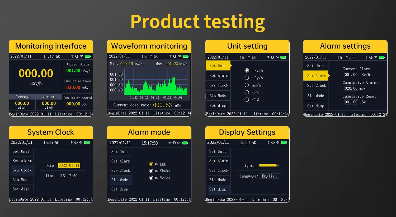Dose equivalent rate:: 0.00-10000uSv/h (10mSv/h)