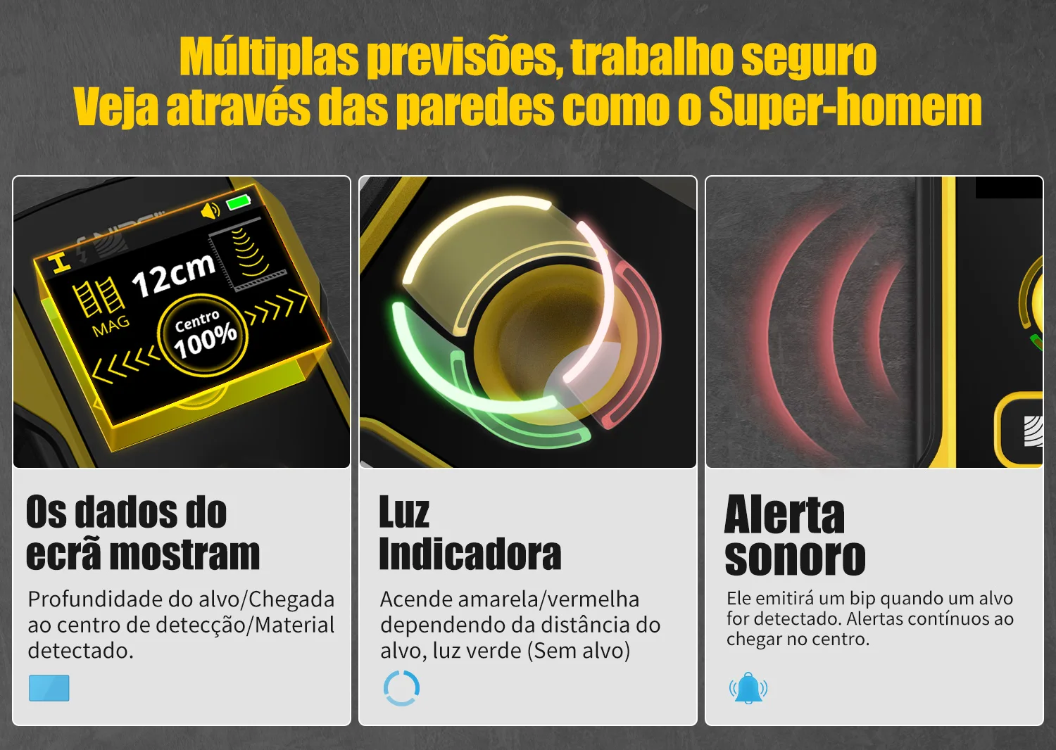 Tamanho portátil: o tamanho pequeno desta ferramenta é muito conveniente para o uso diário, você também pode segurá-la facilmente durante o uso. atrás de paredes, pisos e teto. As faixas de medição de madeira são ≤38mm, fios AC ≤50mm, tubos de metal ≤100mm e vergalhões ≤120mm. Exiba a profundidade do alvo, chegue ao centro de detecção e ao material, a luz indicadora acenderá em amarelo ou vermelho dependendo da distância do alvo, a luz verde significa que não há alvo. Também emitirá um bipe quando um alvo for detectado. Amplas aplicações: esta ferramenta pode ser amplamente utilizada na decoração de sua casa, decoração de paredes, instalação de eletrodomésticos, manutenção de rodovias e assim por diante. Design de furo de posicionamento central, você pode marcar diretamente a posição de perfuração após a detecção e obter perfurações de precisão.