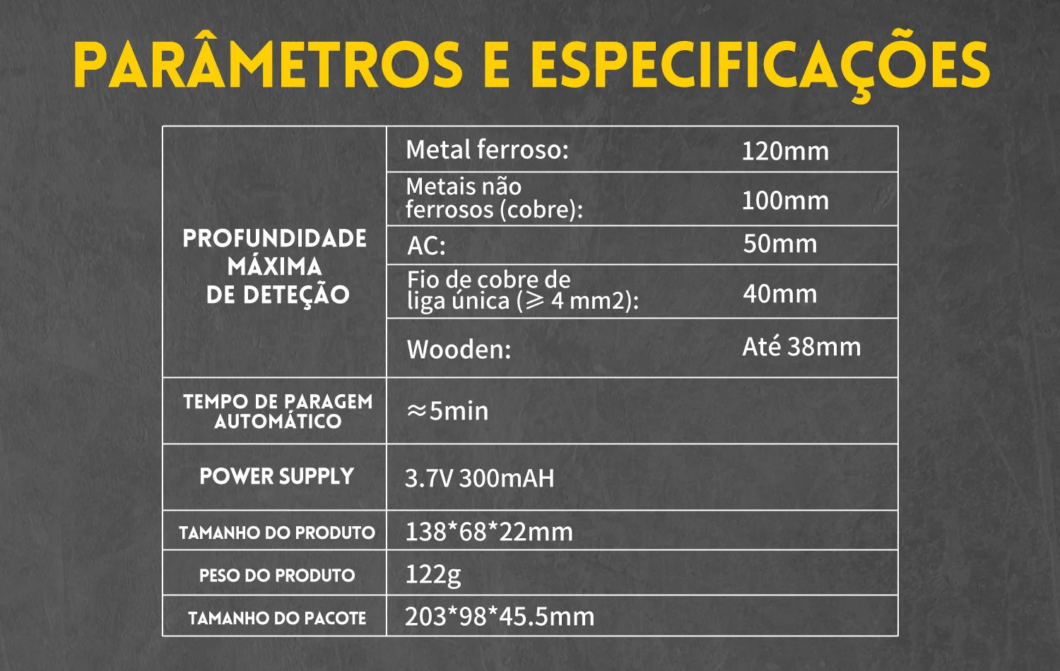 profundidade:Metais: 120mm