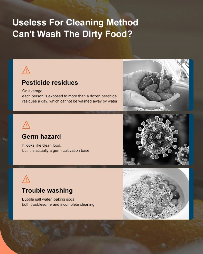 2.Wide use:Remove pesticide residues, kill bacteria, can be used for fruits & vegetables, seafood, meat, grains, tableware, kitchen utensils, etc.