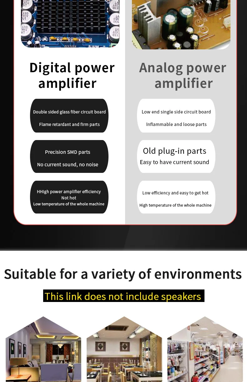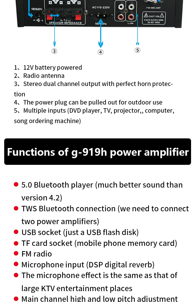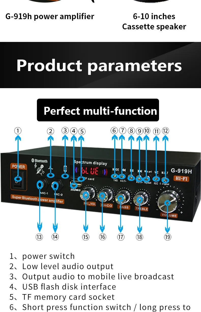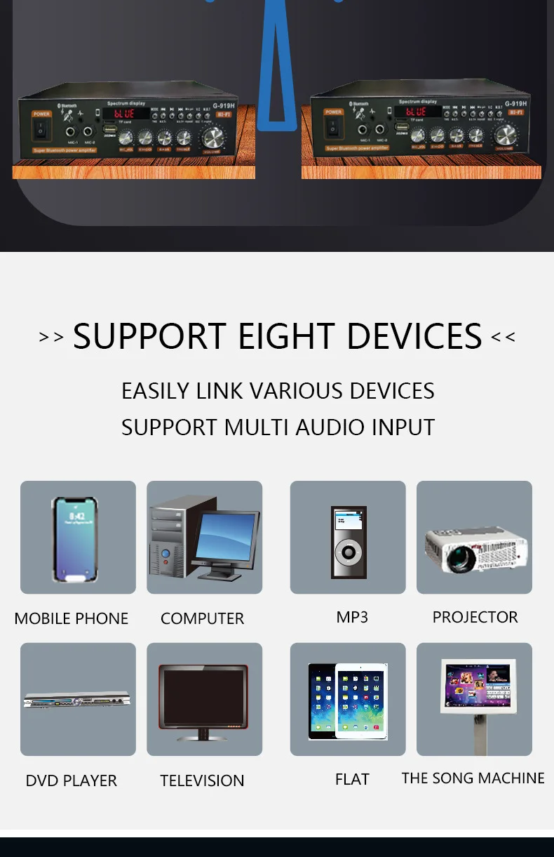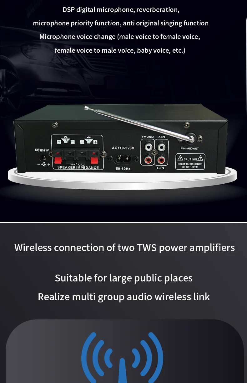 * The amplified power amplifier can be connected wirelessly to connect multiple sets of speakers wirelessly.