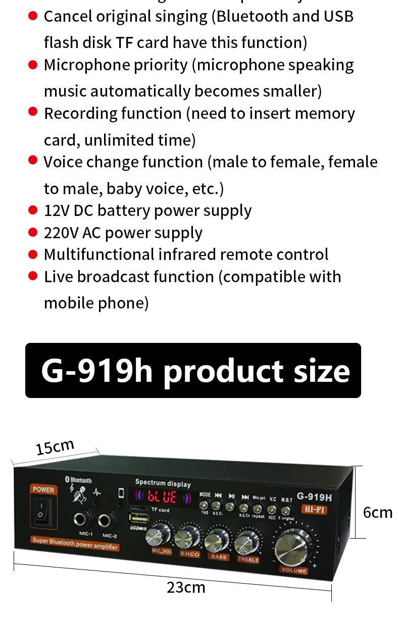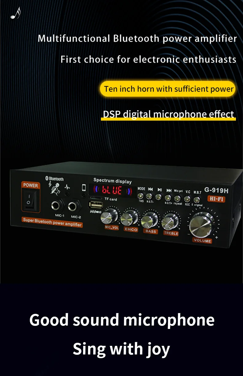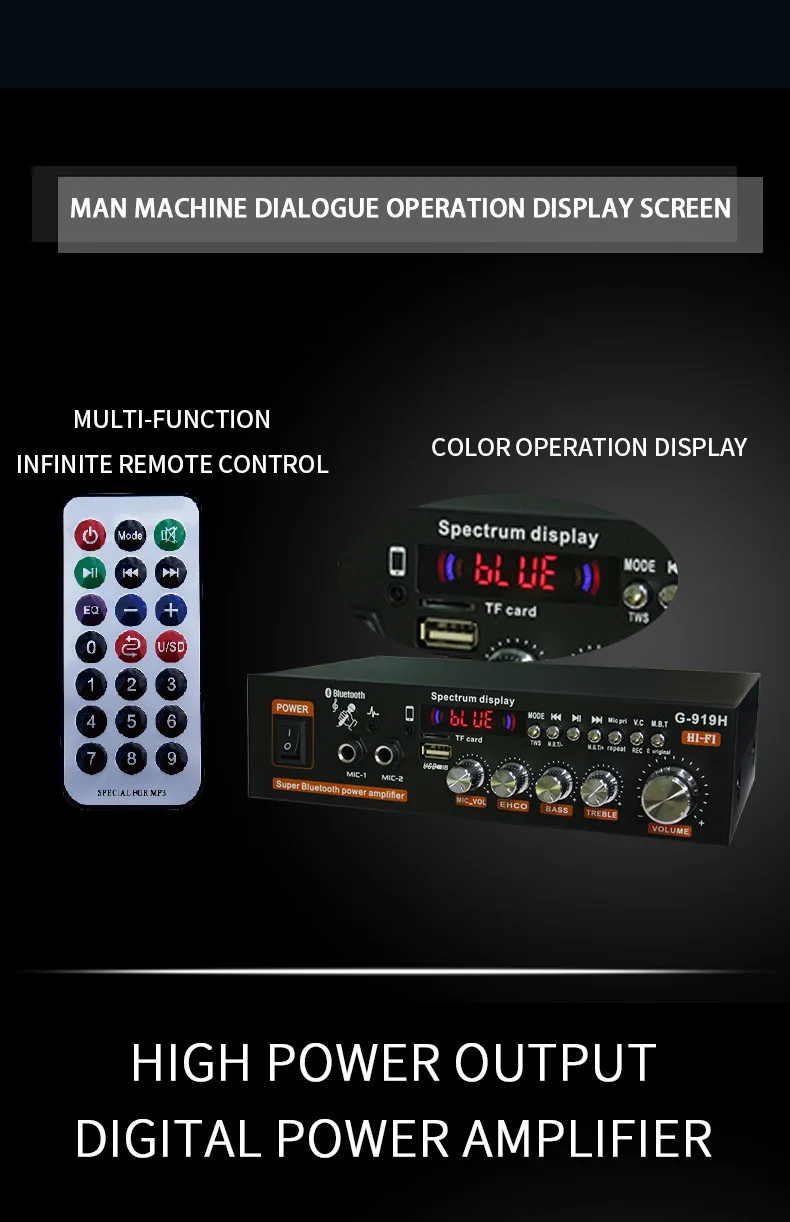 G919H 1000W Home Car Power Amplifiers 2 Channel Bluetooth Surround Sound FM USB Remote Control Mini HIFI Digital Stereo Amp