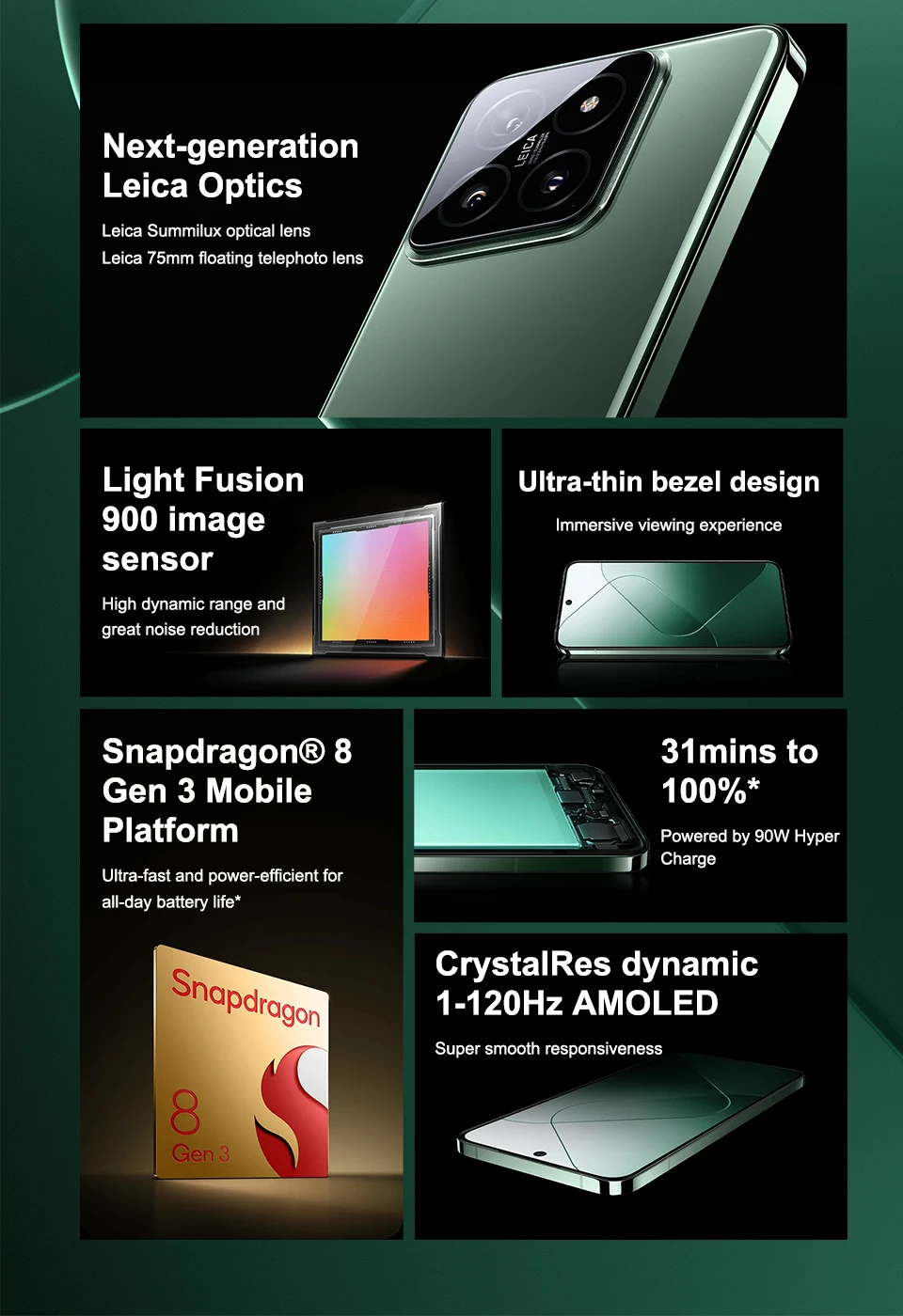 • Flip Design :The flip design of the Xiaomi 14 adds a touch of elegance and uniqueness to the device, making it stand out from other smartphones.
