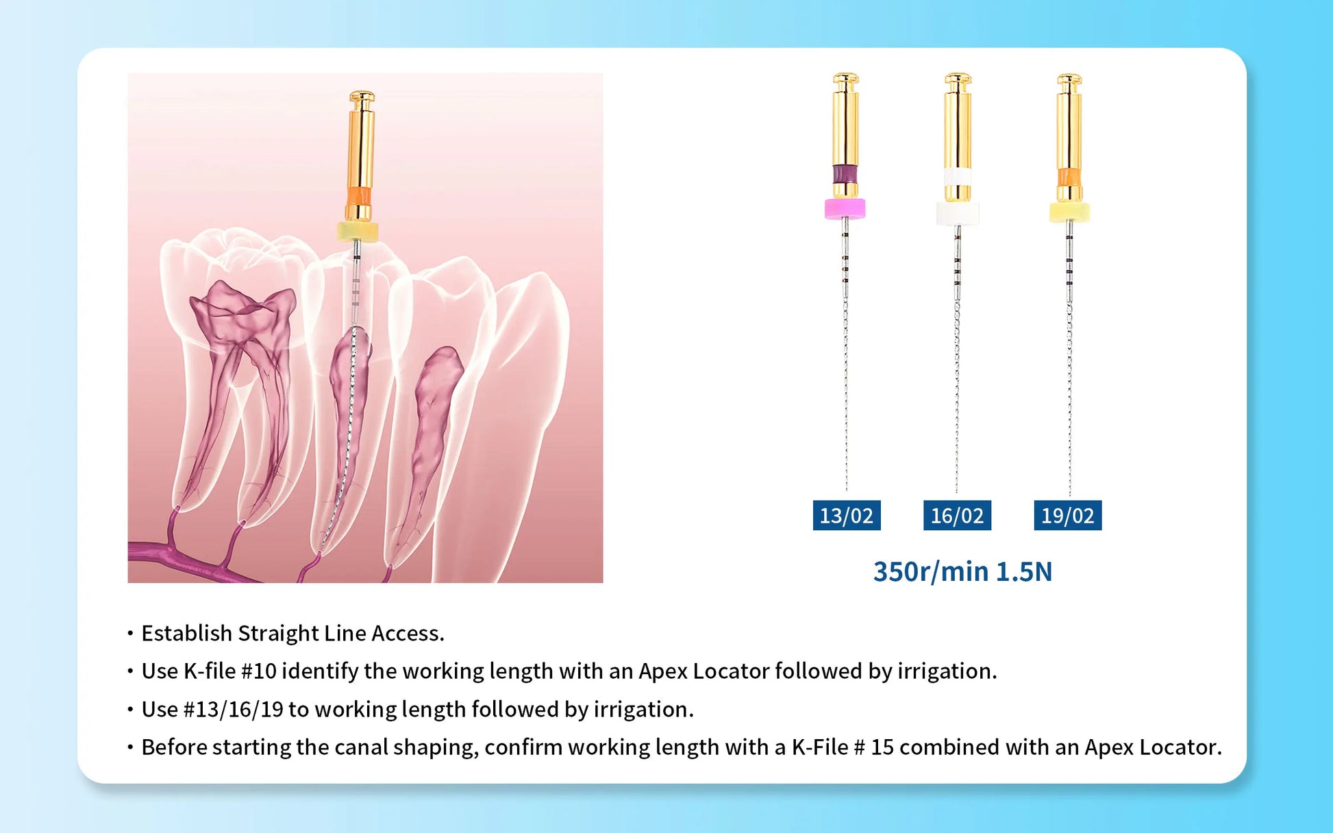 5.After K file #10 has completed root canal opening and forming,use Path File #13/16/19 for dredging and irrigating.