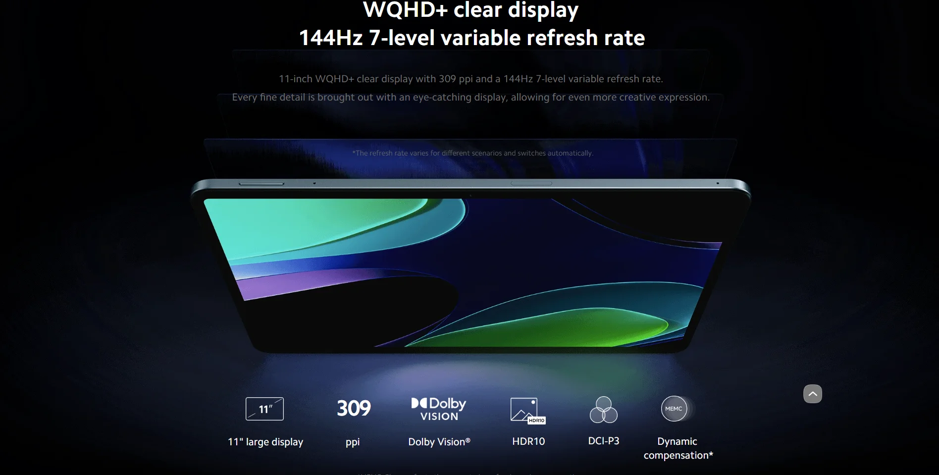 11-inch WQHD+ clear display with 309 ppi and a 144Hz 7-level variable refresh rate.