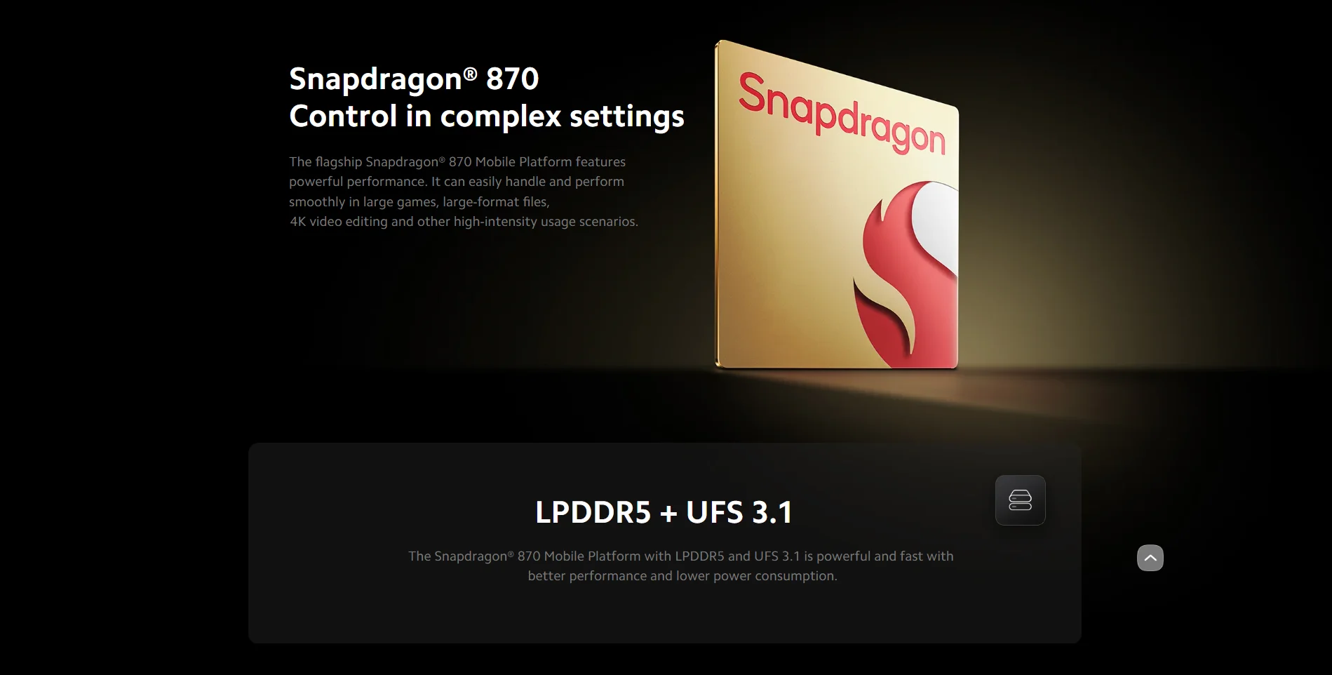 The Snapdragon® 870 Mobile Platform with LPDDR5 and UFs 3.1 is powerful and fast with better performance and lower power consumption.