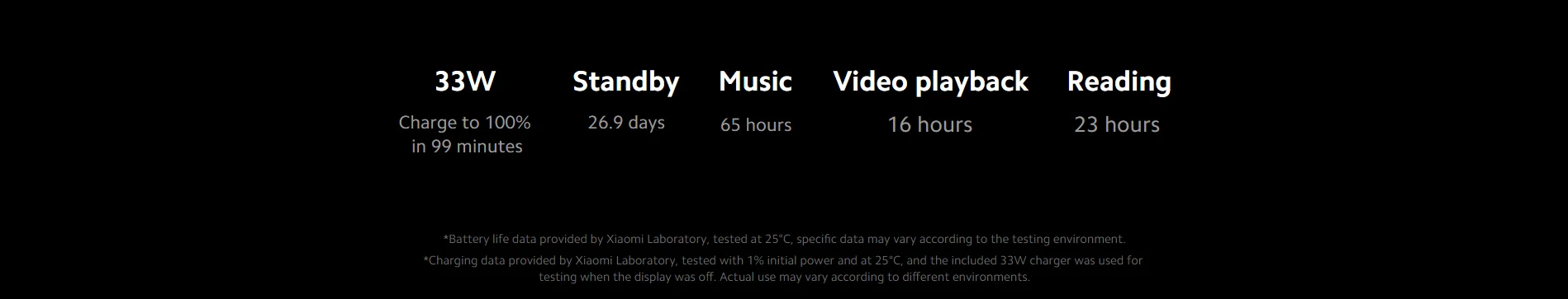 *charging data provided by Xiaomi Laboratory, tested with 1% initial power and at 25'c, and the included 33W charger was used for testing when the display was off. Actual use may vary according to different environments.