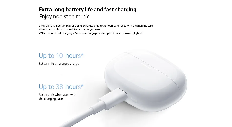 Enjoy up to 10 hours of play on a single charge, or up to 38 hours when used with the charging case