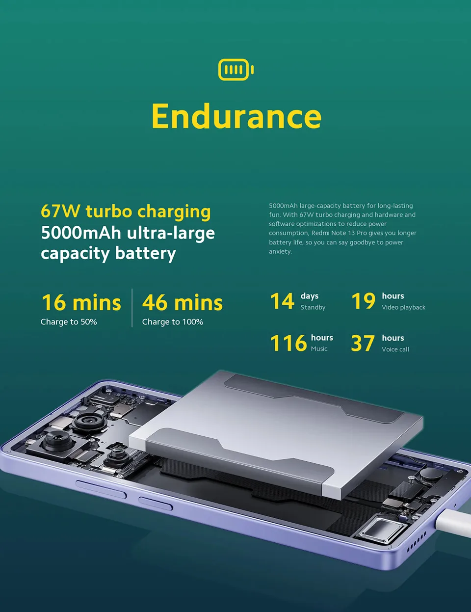 Battery--------- 5000mAh(Typ), Support 67W Turbo Charging, 67W in-box Charger