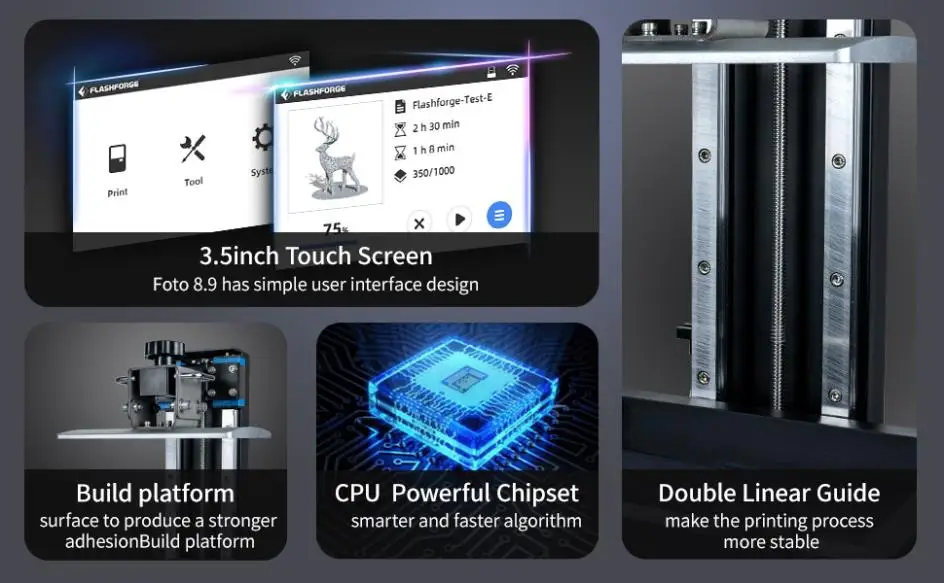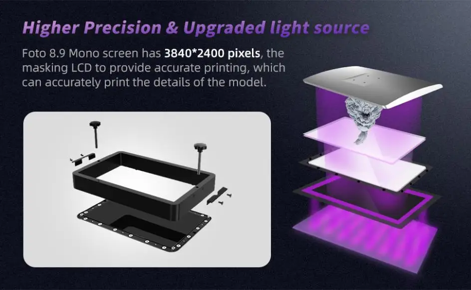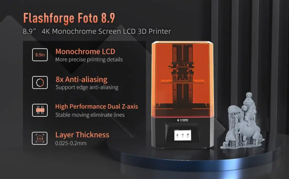 Faster printing speedFlashforge foto 3D printer comes with a 8.9" 4K Monochrome LCD with an HD resolution of 3840 x 2400, and only takes 2 seconds per layer exposure to cure resin yet still delivers outstanding printing results.