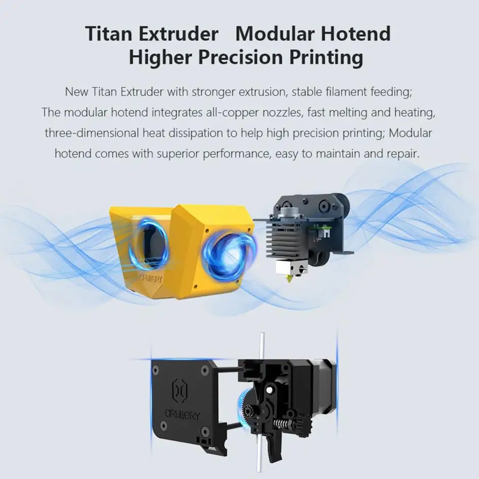 Ekstruder Titan jarak jauh dengan ekstrusi yang lebih kuat, pemberian filamen stabil. Hotend modular mengintegrasikan semua nosel tembaga, peleburan dan pemanasan cepat, disipasi panas tiga dimensi untuk membantu pencetakan presisi tinggi.