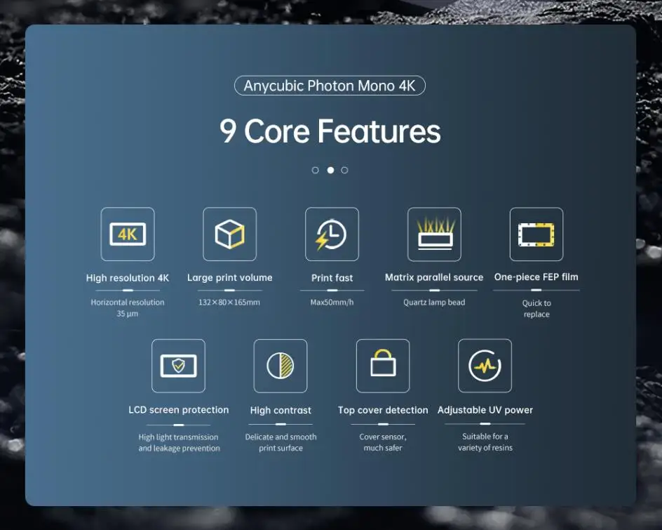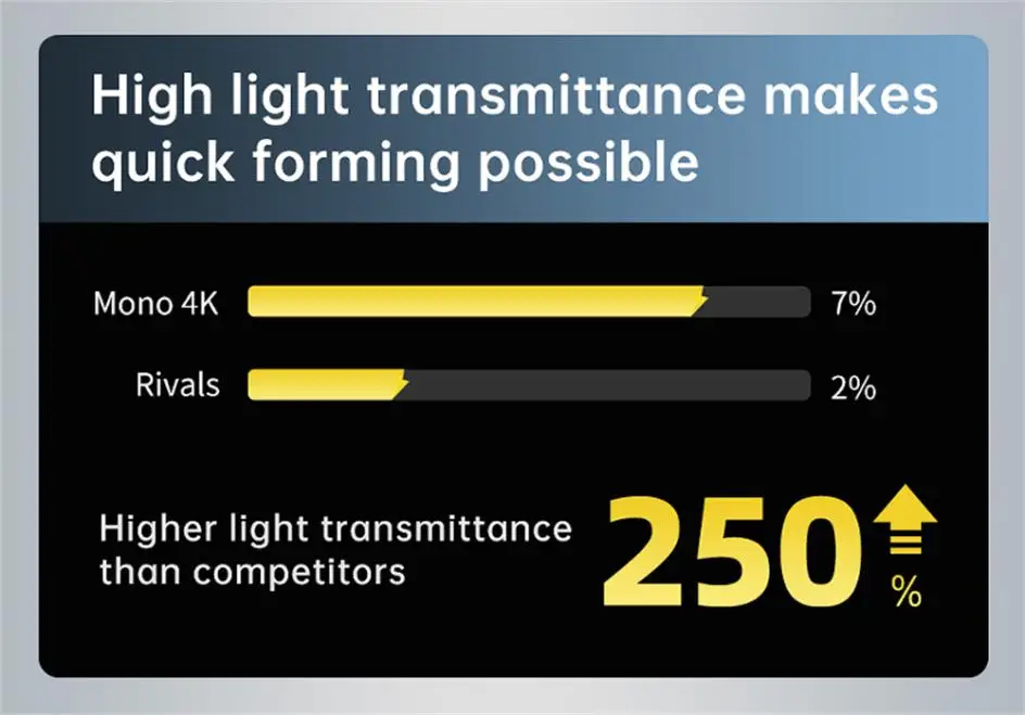 Mono 4K hasa 3840×2400 printresolution, 35um XY pixelsand 7% light transmittance, which could deliver highly detailed prints. Thesingle-layercuring time is as low as 1.5seconds, and the printing speed can reach 50mm/h.