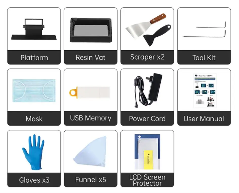 Platform, Resin Vat, Scraper x2, Tool Kit, Mask, USB Memory, Power Cord, User Manual, Gloves x3, Funnel x5, LCD Screen Protector