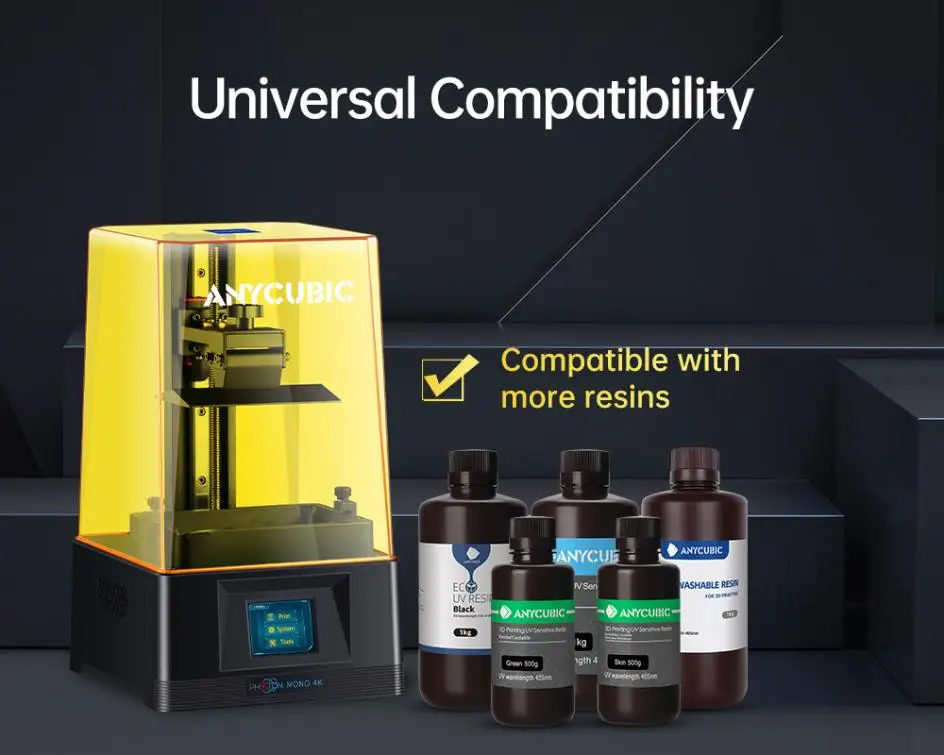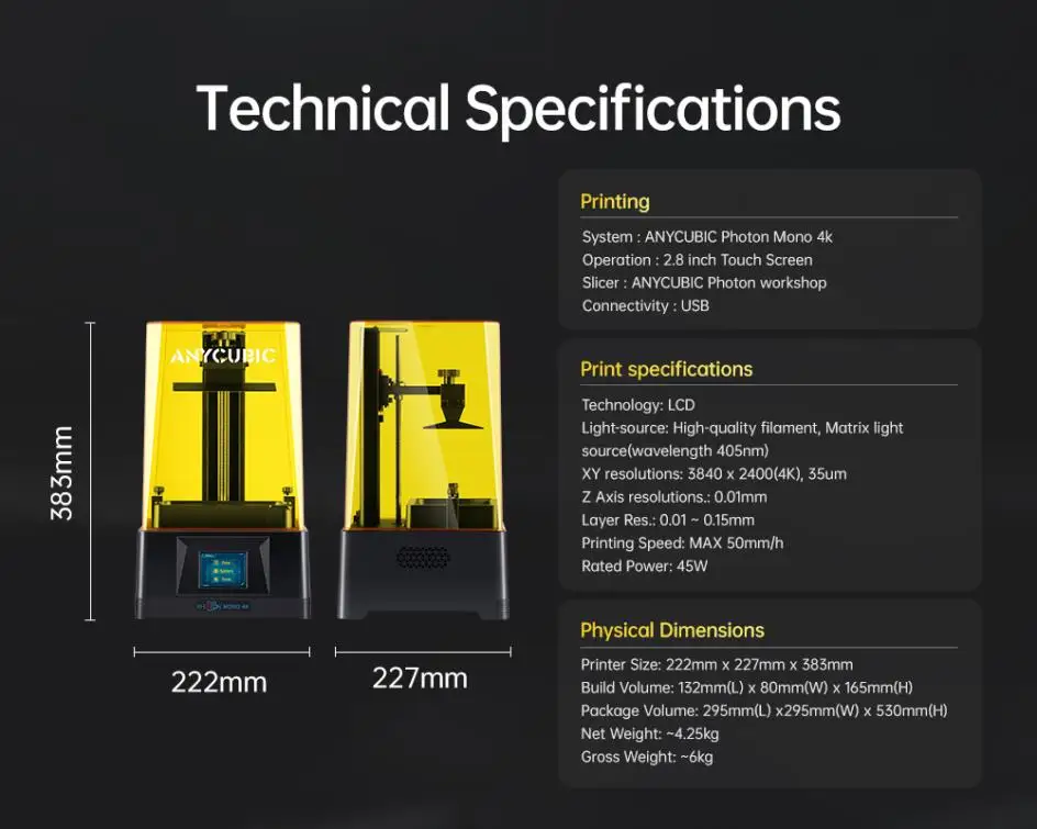 With 30%-100% light power regulation, Anycubic Photon Mono 4K supports not only ordinary 405nm UV resins, but also special resins, making it compatible to more materials and environments.In addition, adjusting the light power appropriately can extend the lifespan of both the screen and light significantly.Technical Specifications