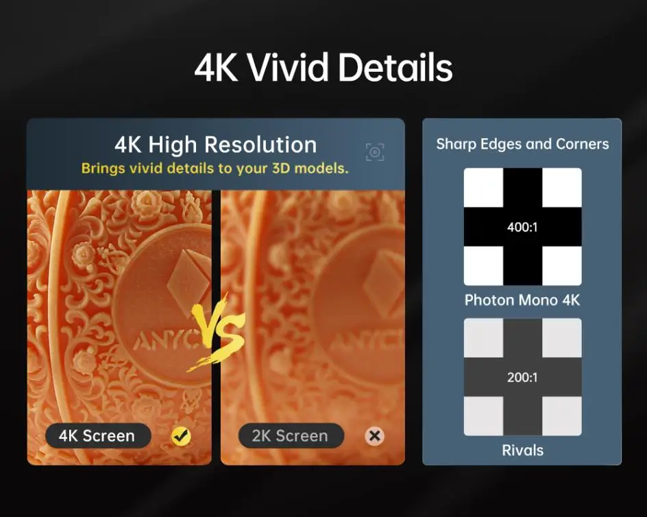 Mono 4K uses a monochrome screen with a contrast of more than 350. The high contrast makes the image in the exposure area more accurate and the print edges more delicate, thus improving the printing quality and success rate, and greatly reducing the residue in resin vat.