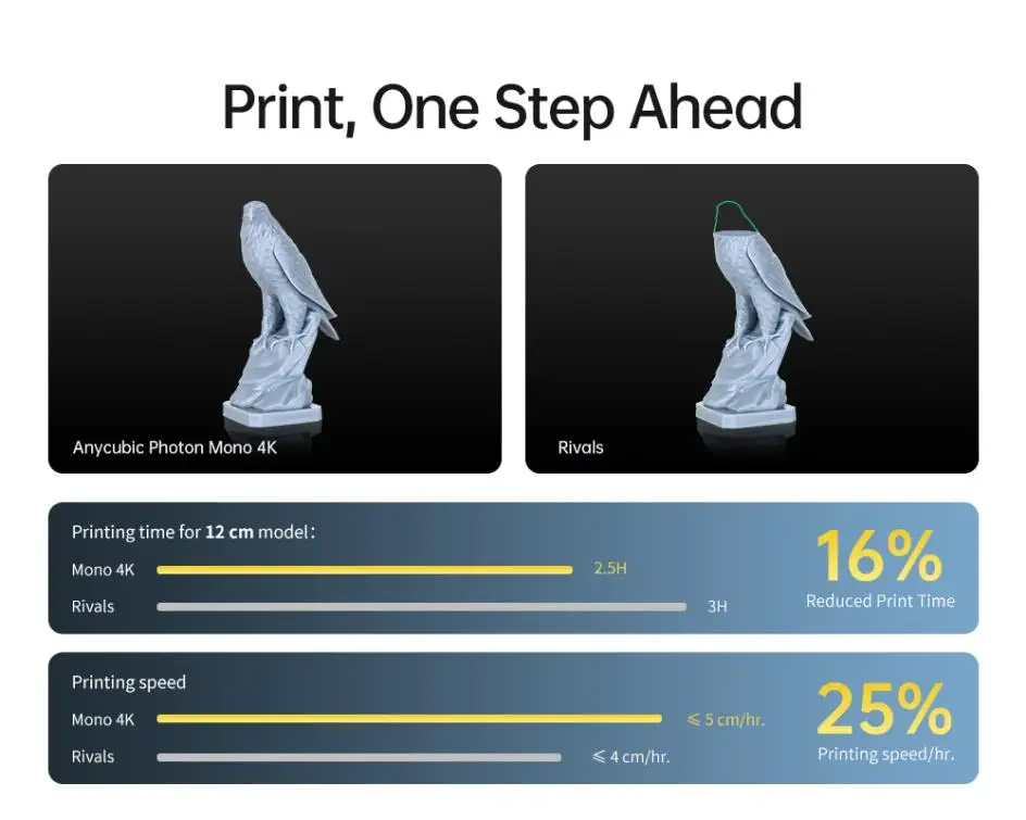 With an impressive print speed at 5 cm/hr./1.97 in./hr.,Anycubic Photon Mono 4K can print a typical 12cm/4.7in. model in 2.5 hours,which takes 3.5 hours less than Anycubic.Photon's 6 hours,and 30 mins less than its rivals' 3 hours.Fast printing saves your time wasted on waiting.