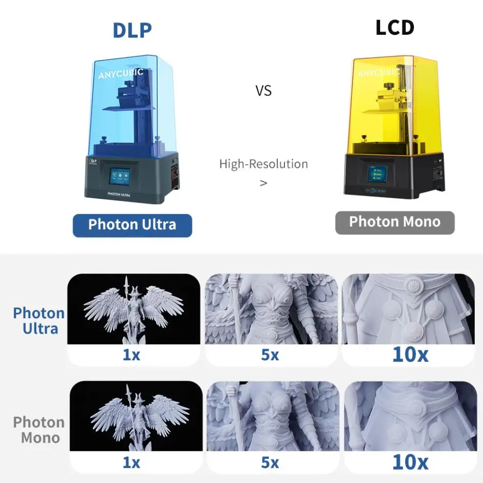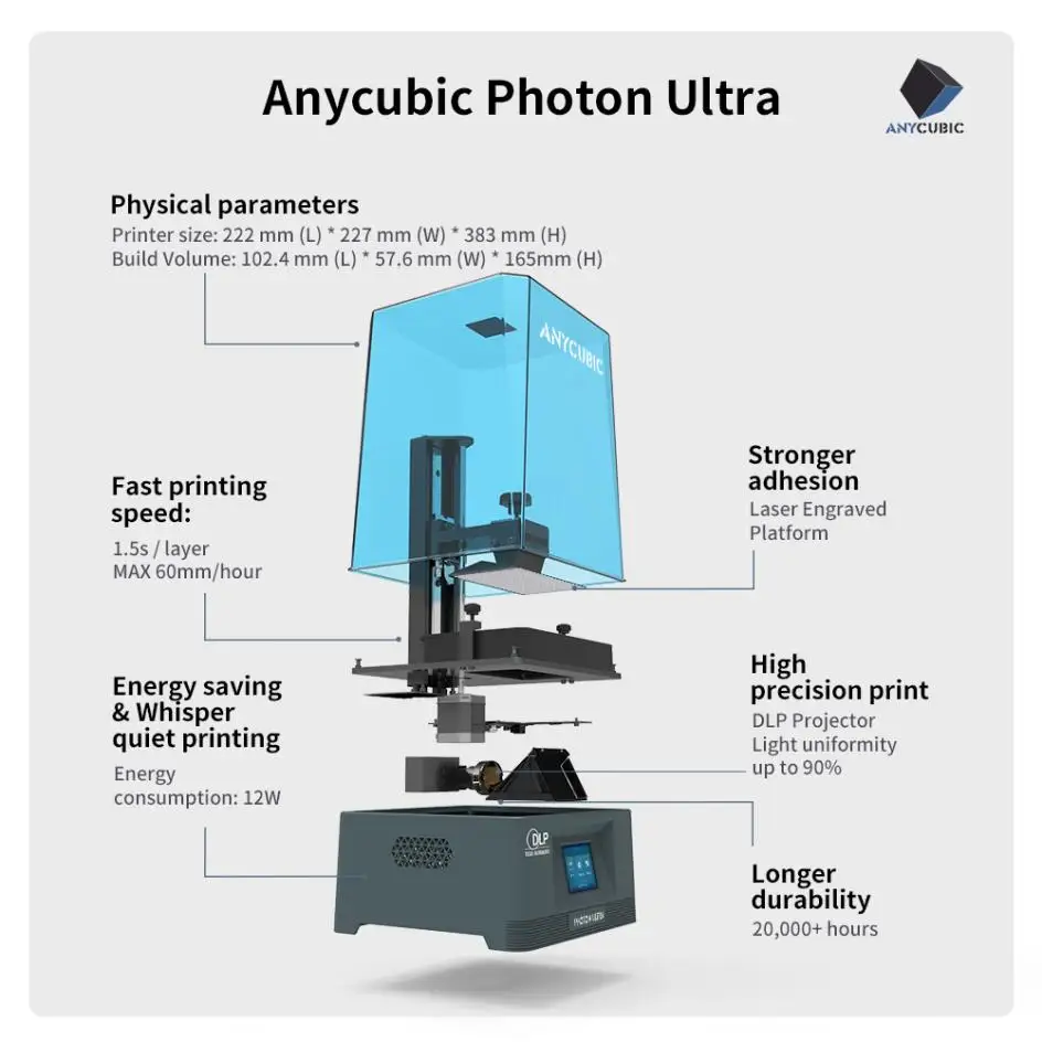 Anycubic Photon Ultra is a groundbreaking consumer DLP 3D printer. Anycubic co-engineered with Texas Instruments to introduce Digital Light Processing (DLP) technology into the desktop 3D printer industry.
