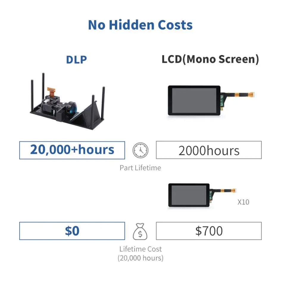 Thanks to DLP® technology, Anycubic Photon Ultra's light source system does not need to be replaced as often as an LCD 3D printer and has a life span of over 20,000 hours, 10 times longer than the 2,000 hours for LCD monochrome screens. Maintenance costs have been greatly reduced.