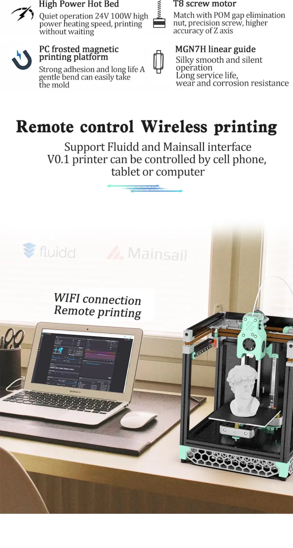 3: Important point:built-in system, the machine is assembled directly into the debugging printing process, support for printing PLA/PETG/ABS/PA and other materials, technical support is provided, no worries.