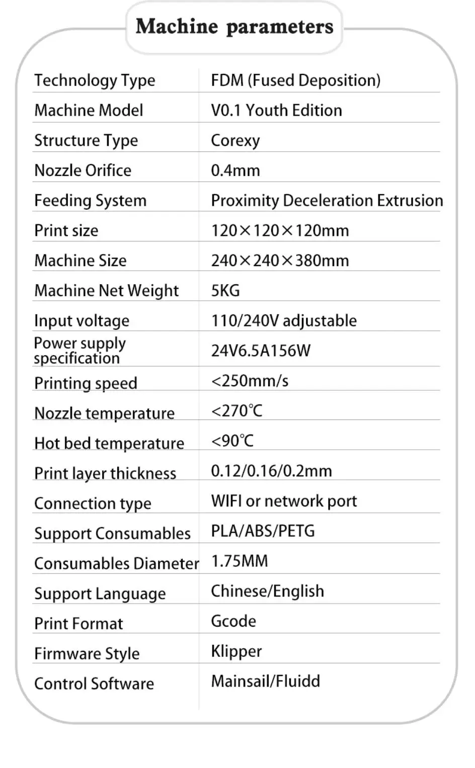 Maximum Printing Speed: 250mm/s