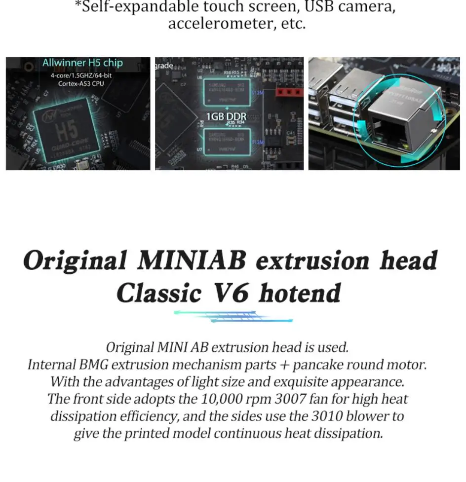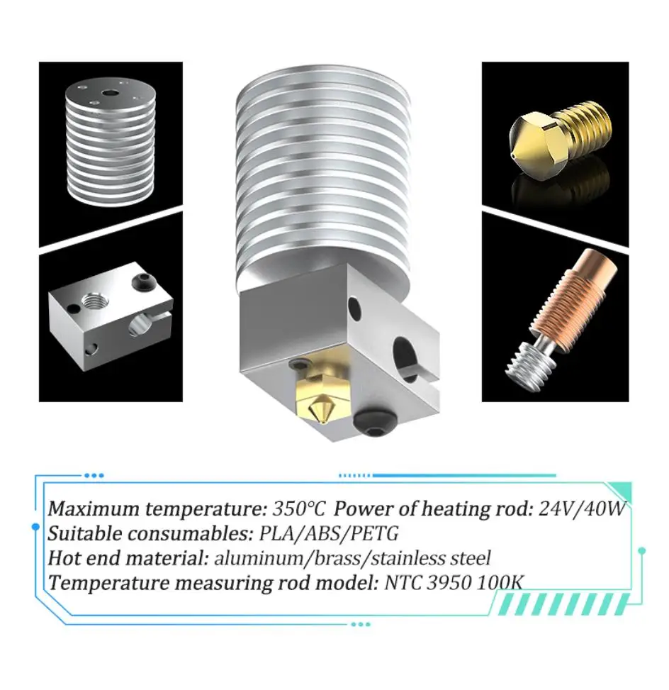 2:V6 hotend iscustomized, the maximumtemperature of 350 °, bimetallic throatthree-hole nozzle.
