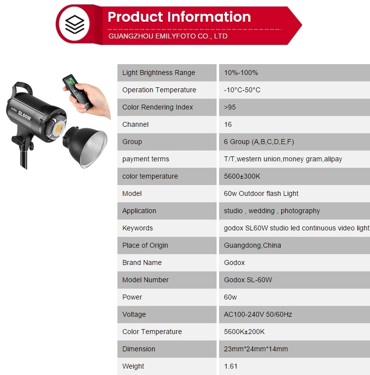 Godox SL-60W 5600K White Version Bowens Mount Led Continuous Light with Remote Control for Studio Photo Video Recording