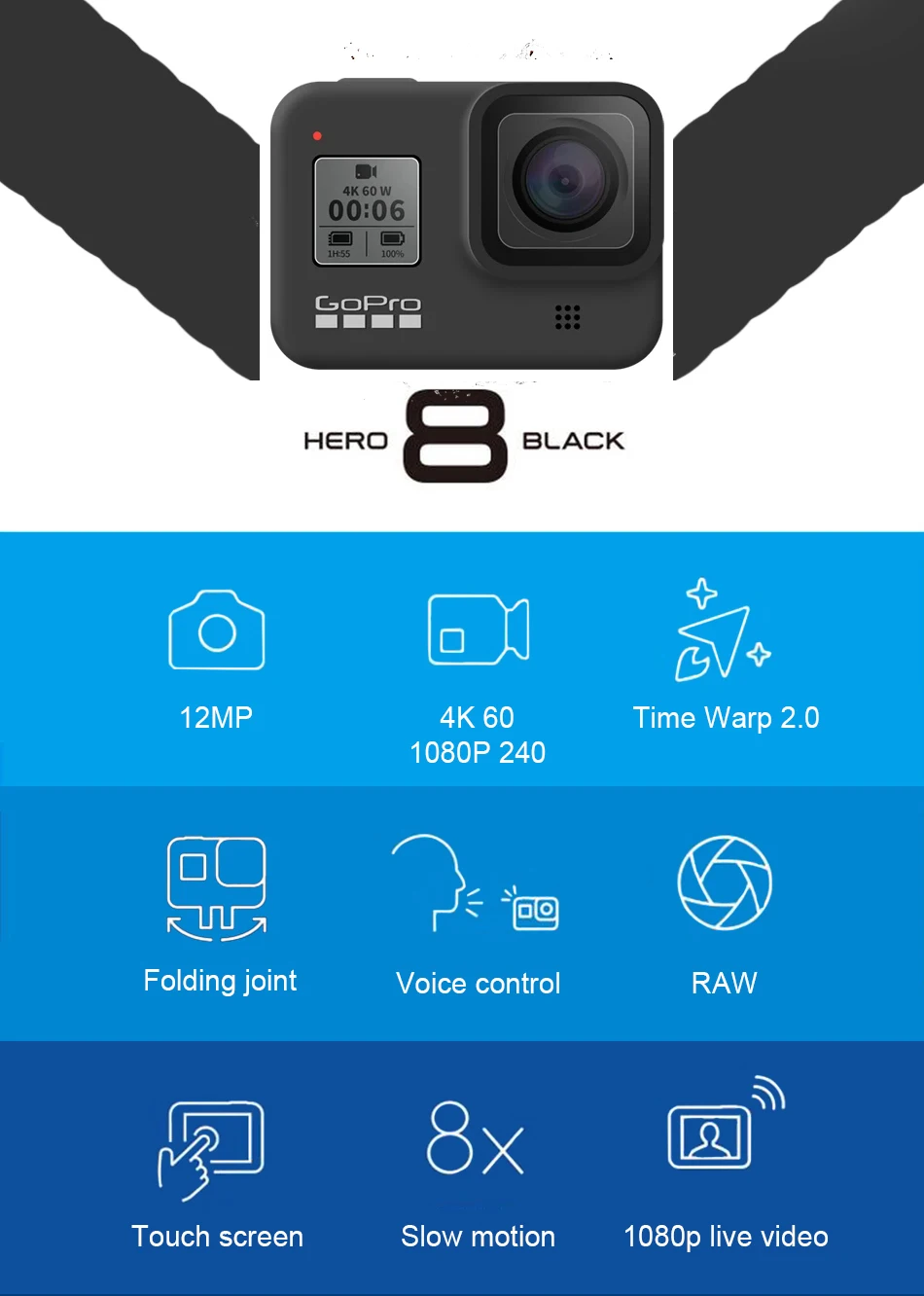 GoPro augments its already impressive action camera line with the HERO8 Black, the versatile next-generation action cam designed to capture smooth, stable footage of your latest adventure, from a simple boat trip to a wild jump-off-a-mountain ride. The HERO8 Black features updated HyperSmooth 2.0 stabilization to produce smooth, gimbal-like movement at all supported frame rates, without the need for a gimbal. You can also use the HERO8 Black as a webcam on your computer using a free, downloadable app. Additional updates include a sleeker physical design with a "folding fingers" type base for fast mounting, a redesigned battery door for quicker battery changes, a lens with twice the impact resistance as the HERO7, an optional Battery Mod for nearly 2.5x more battery life, an optional flip-up Display Mod to make viewing your frame easier, an optional LED Light Mod, and an optional Media Mod to expand your accessory possibilities.