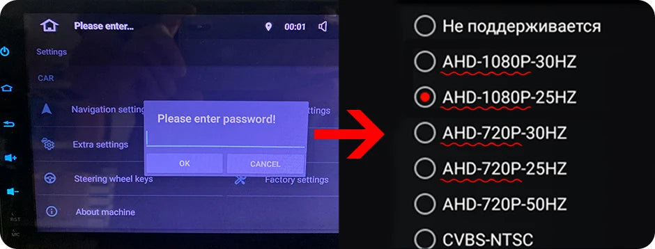 Go to Car settings >> Factory settings >> Reverse (picture) settings >> Select AHD