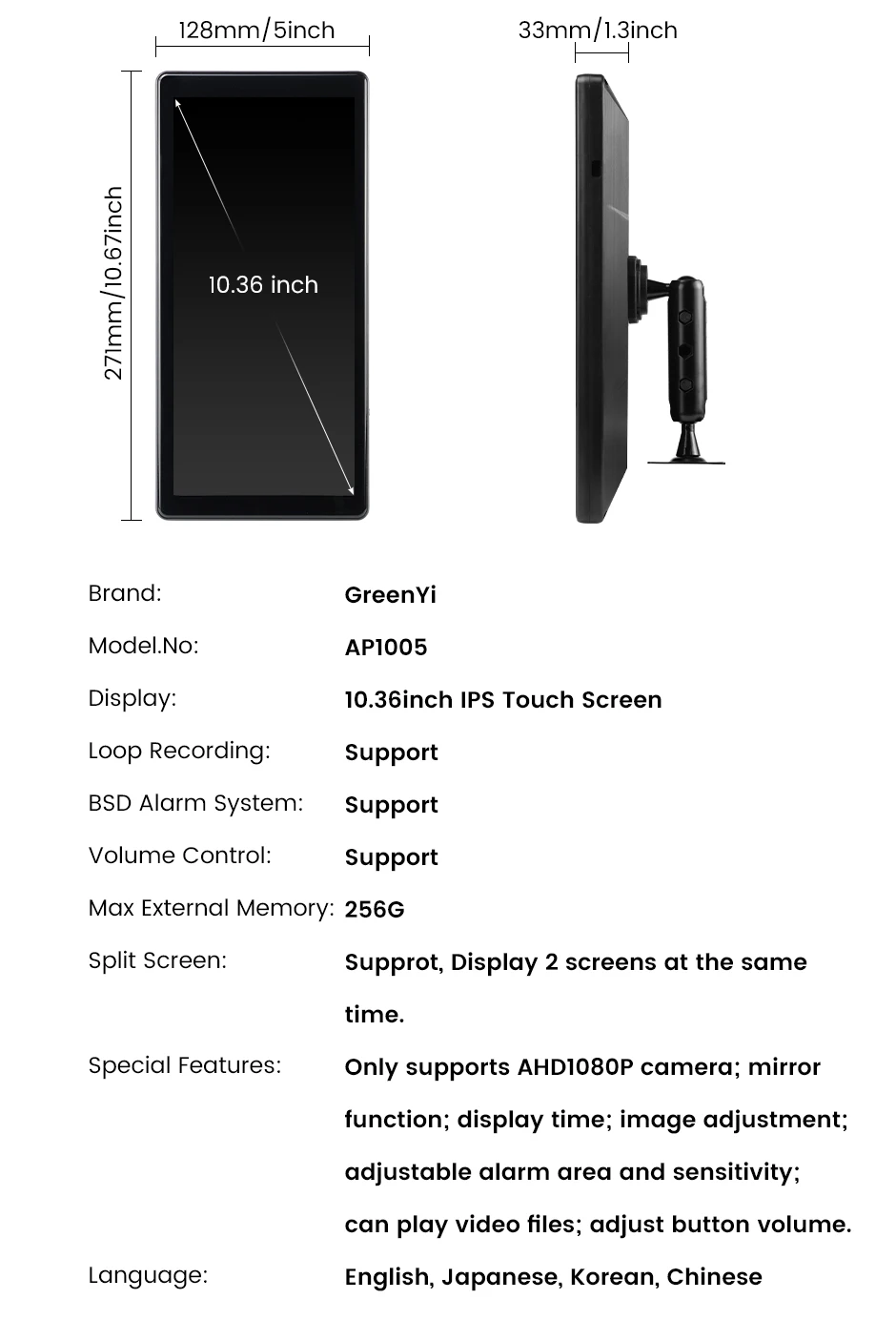 * 10.36 inch IPS touch screen. 2-channel screen split screen display.