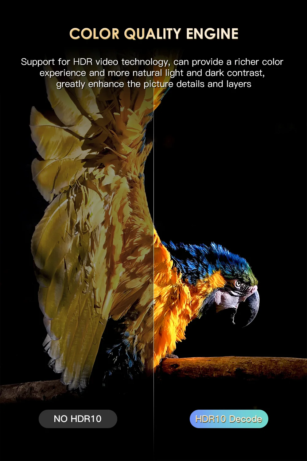 Support for HDR video technology, can provide a richer colorexperience and more natural light and dark contrast,greatly enhance the picture details and layers