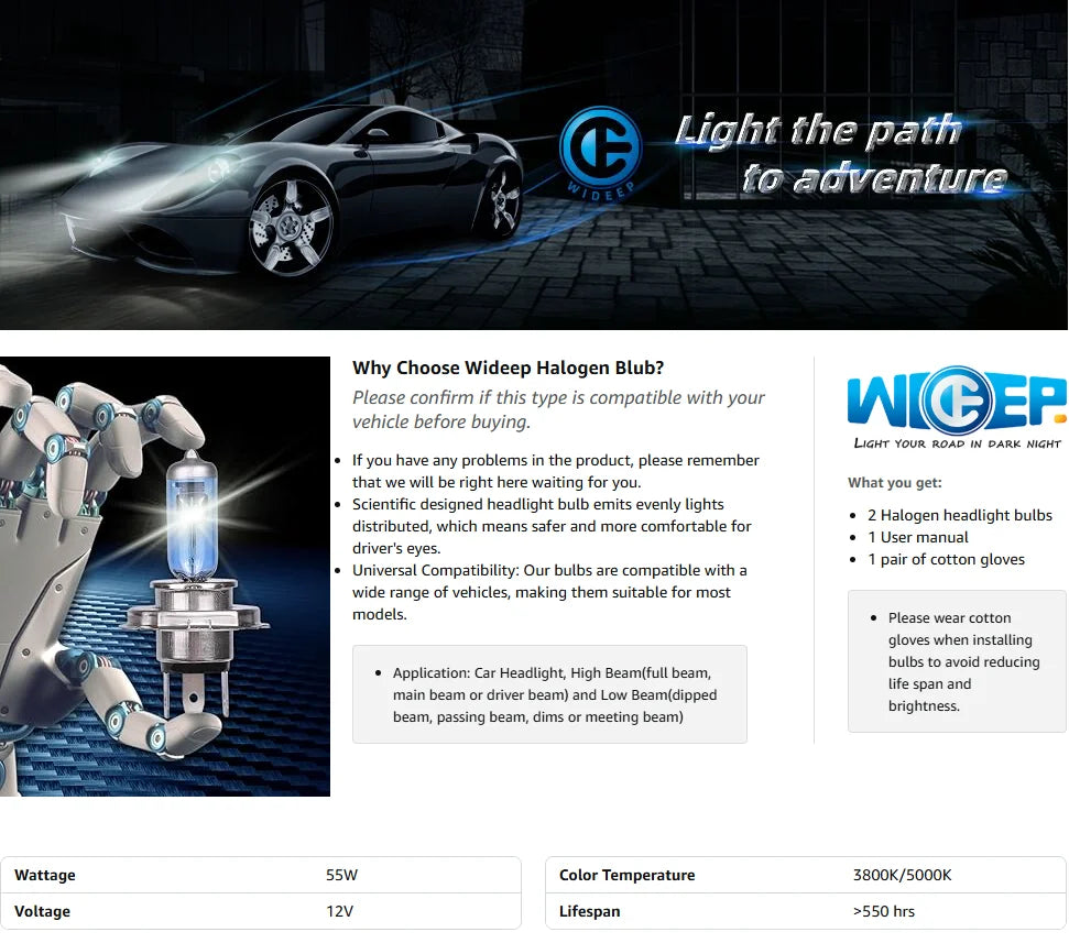Universal Compatibility: Wideep halogen bulbs fit most cars. Little compatibility concern. In most cases, they can fit your vehicle's headlight/fog light well and serve as an easy way to upgrade your lighting system.
