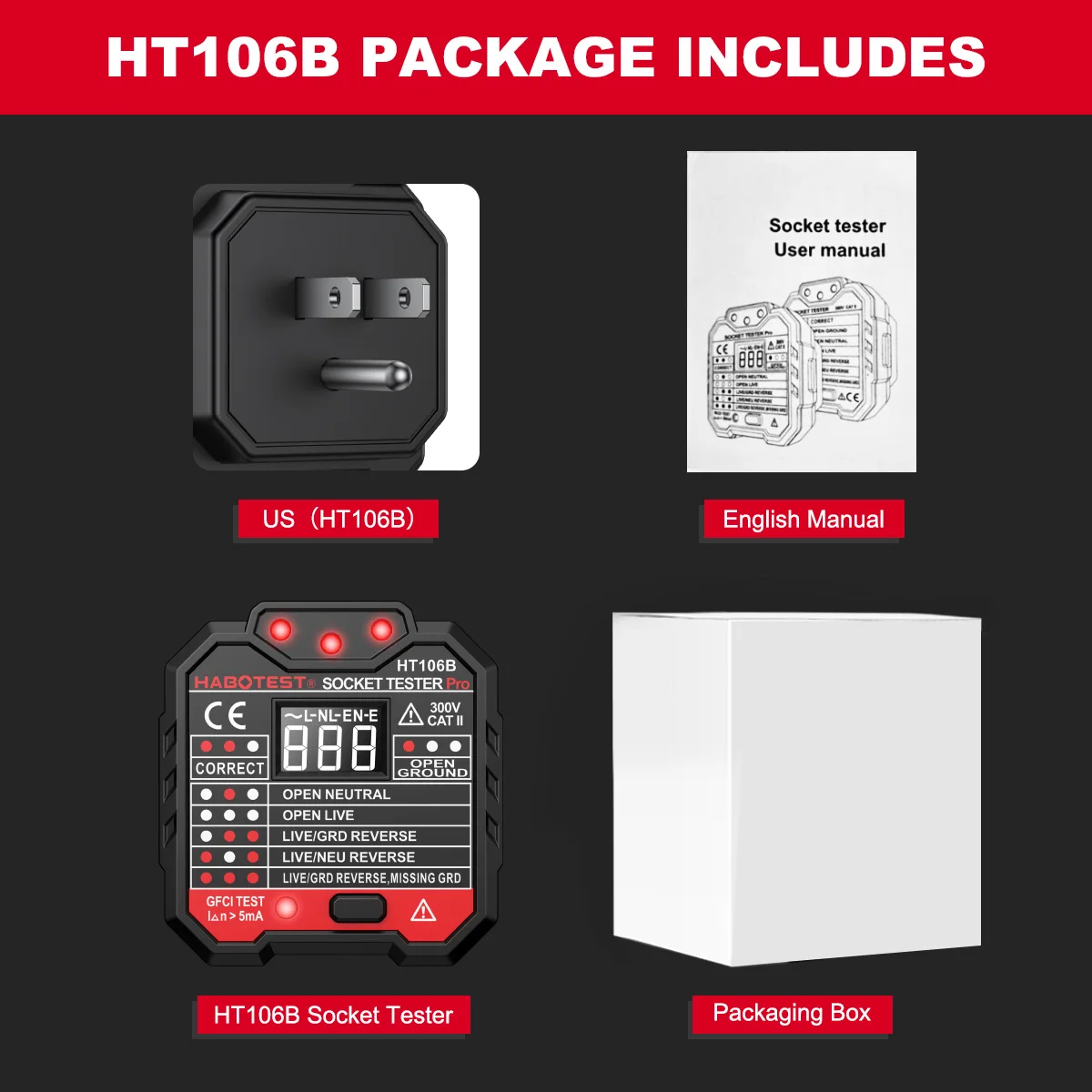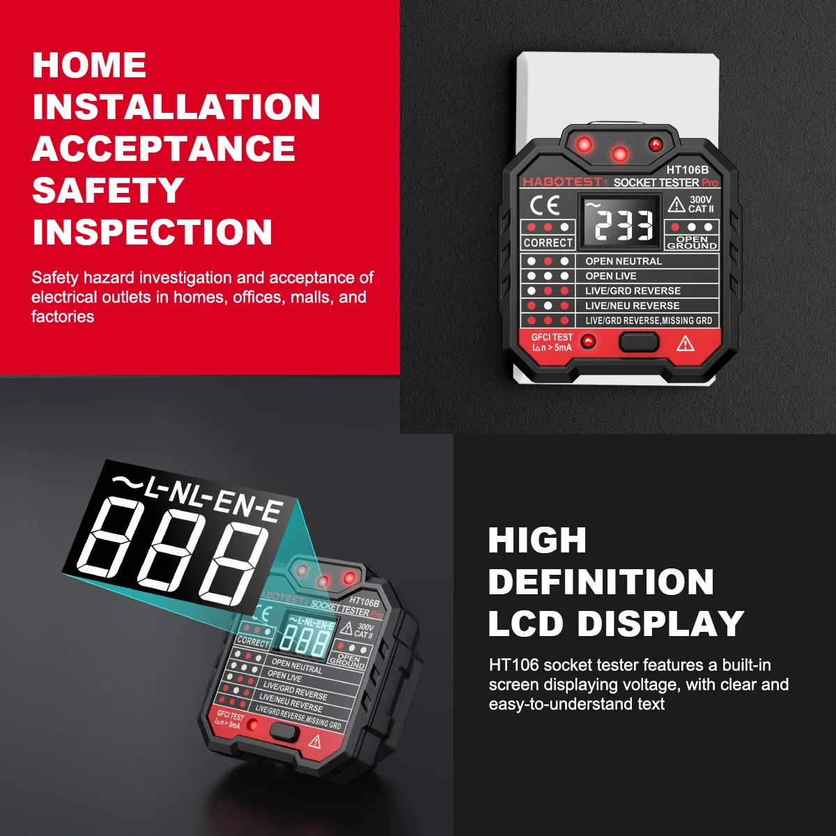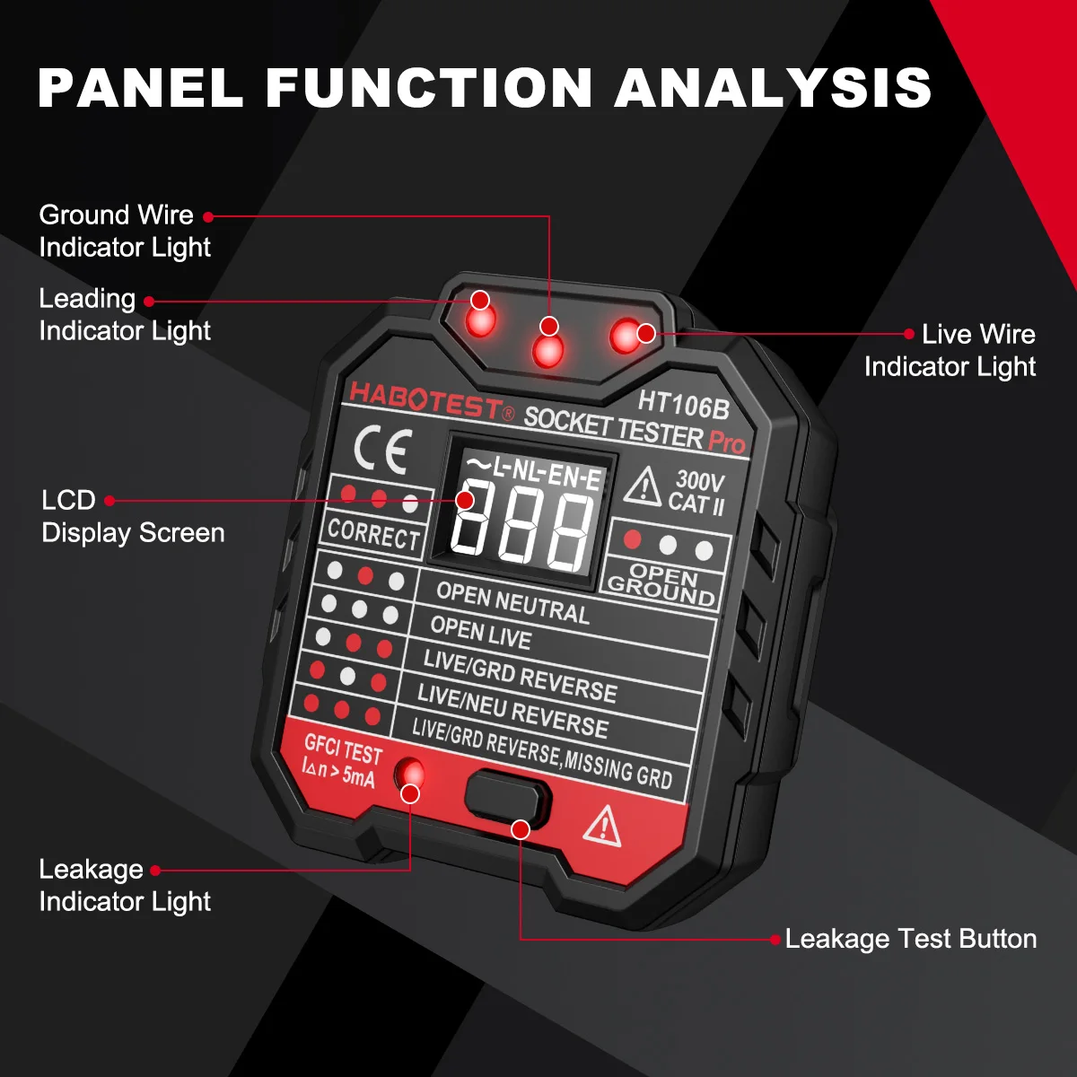 HABOTEST HT107 Socket Tester Pro Voltage Test RCD 5/30mA Socket Detector Ground Zero Line Plug Polarity Phase Check
