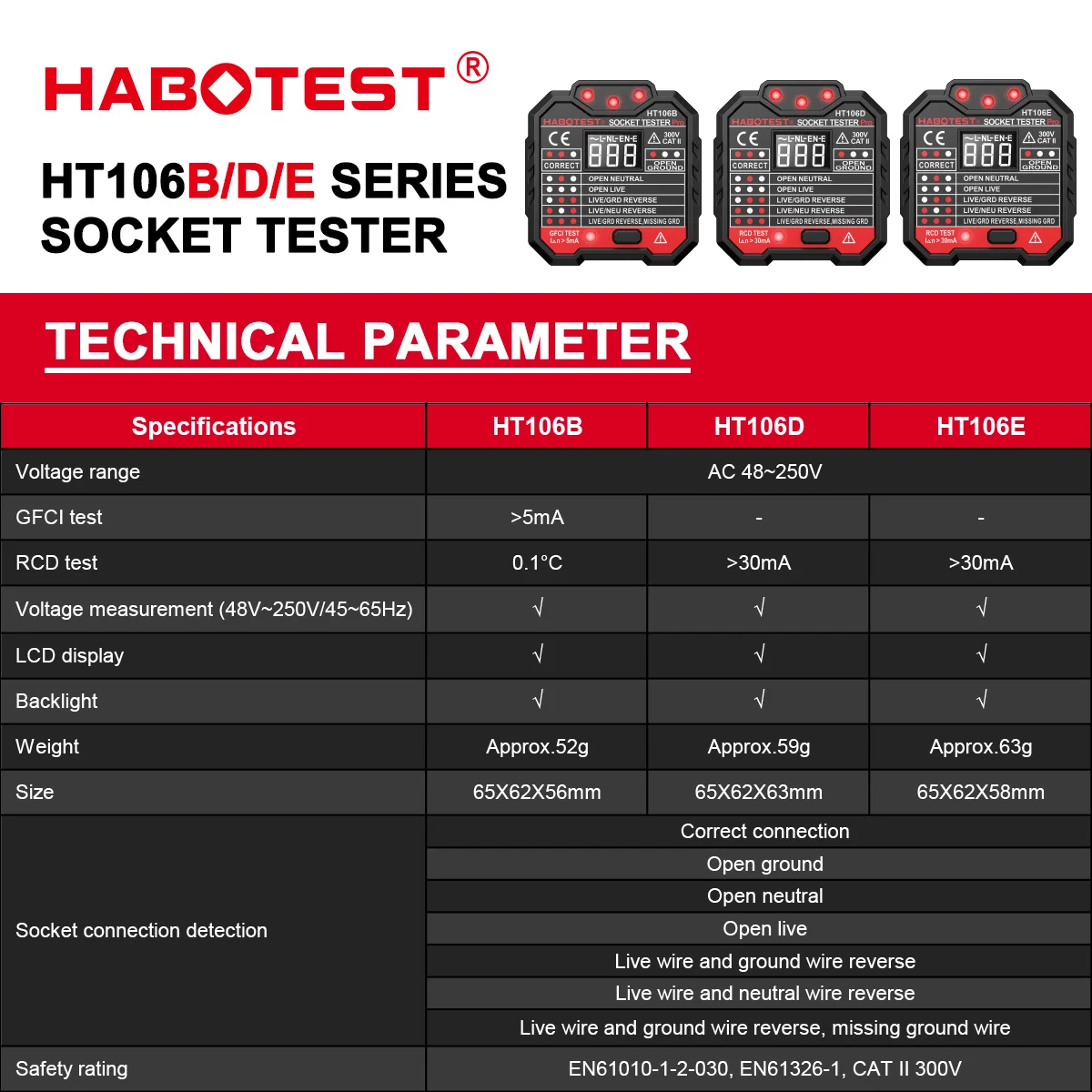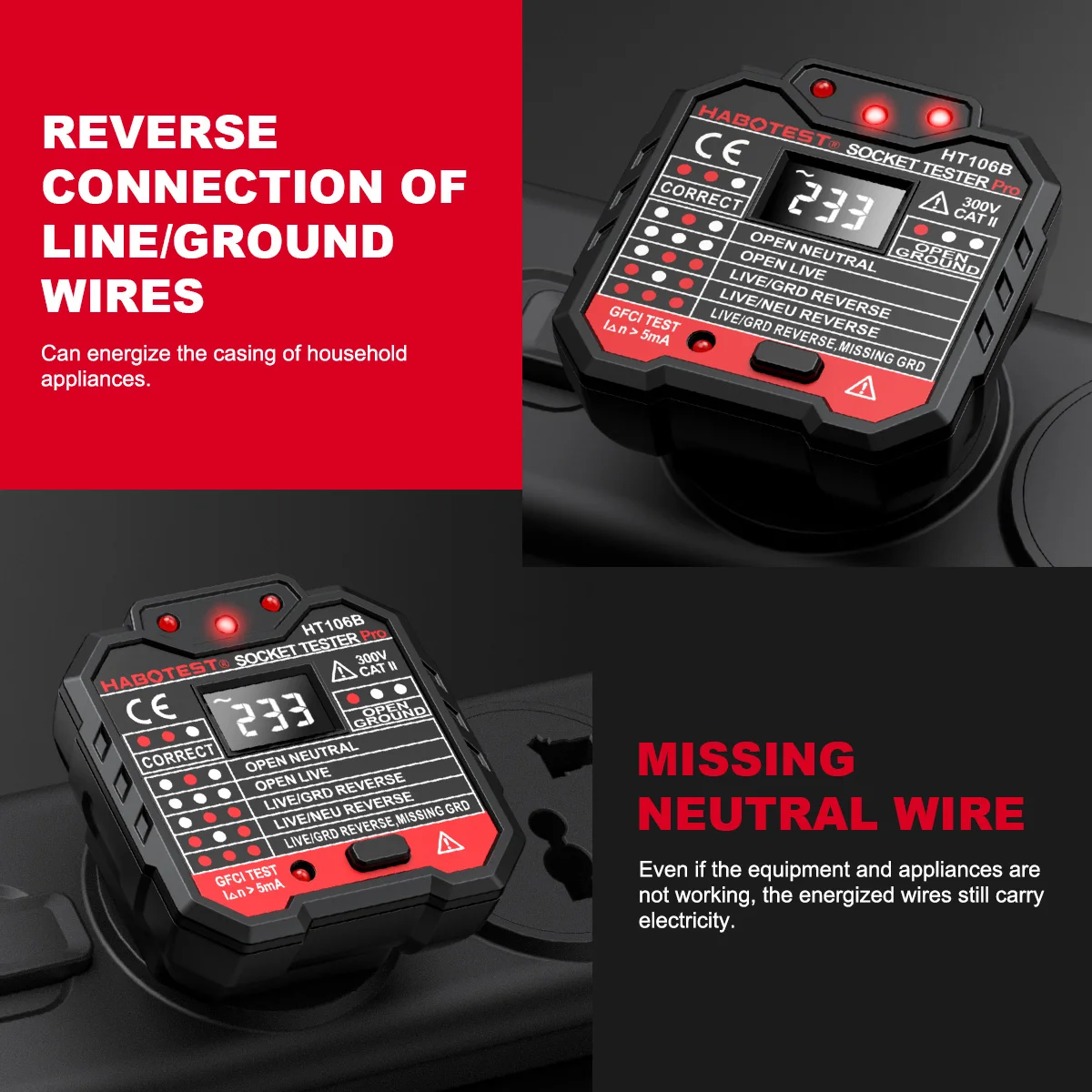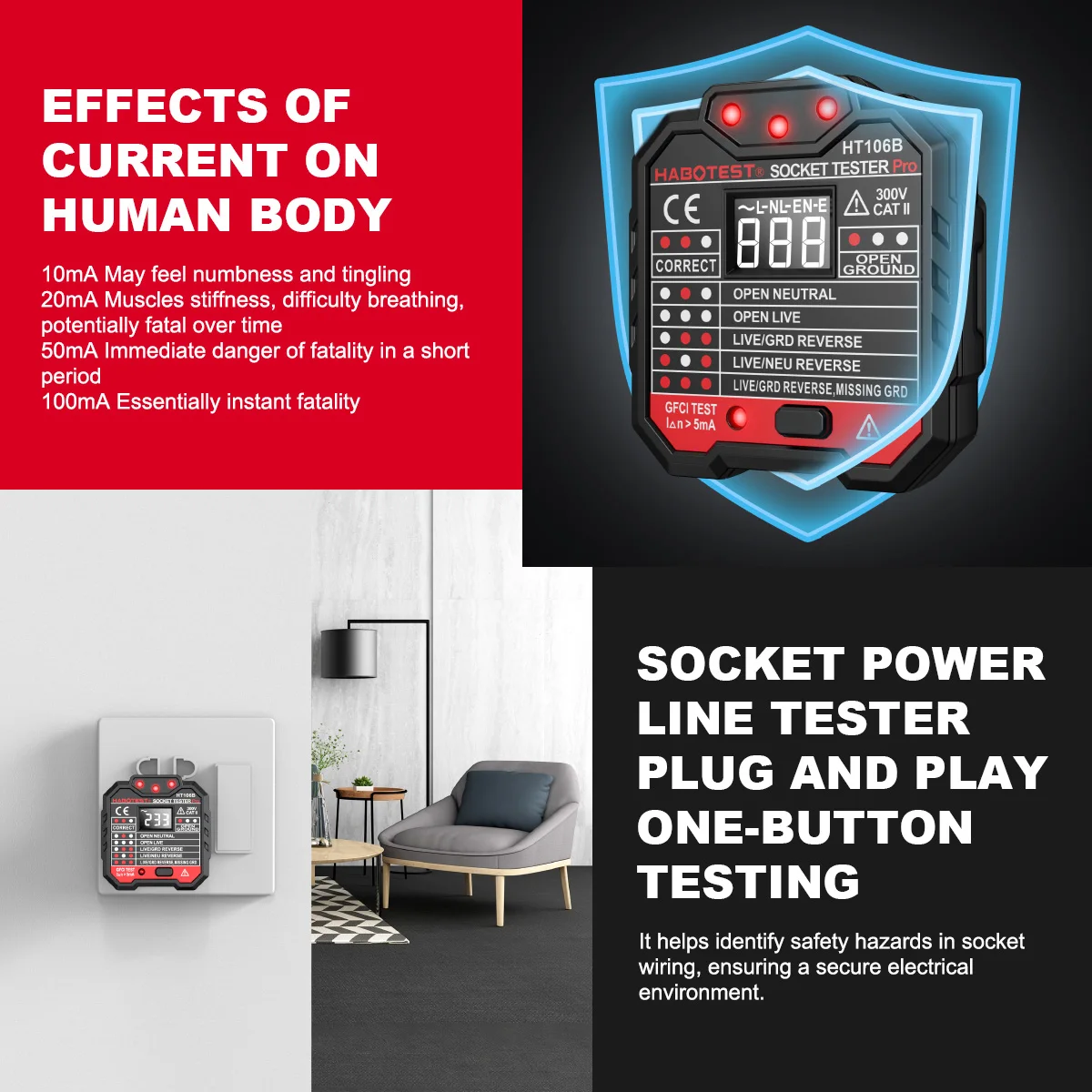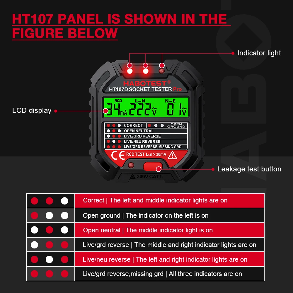 HABOTEST HT107 Socket Tester Pro Voltage Test RCD 5/30mA Socket Detector Ground Zero Line Plug Polarity Phase Check