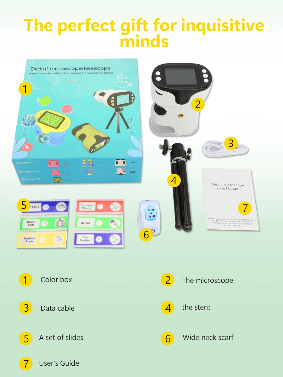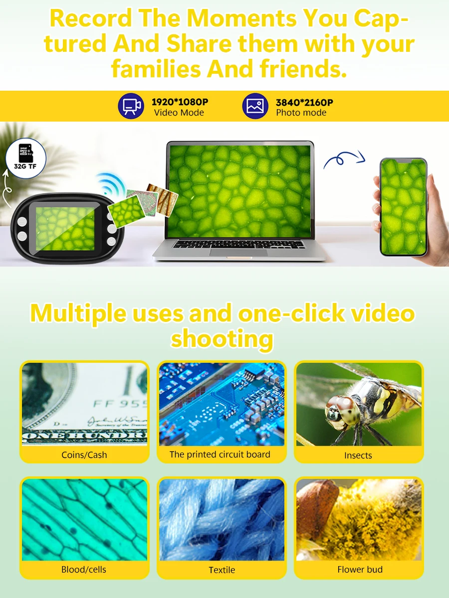 Features: 1000X, multiple people can observe, can take photos and videos, built-in LED lights, high-definition display screen, long charging range, 32GB memory card