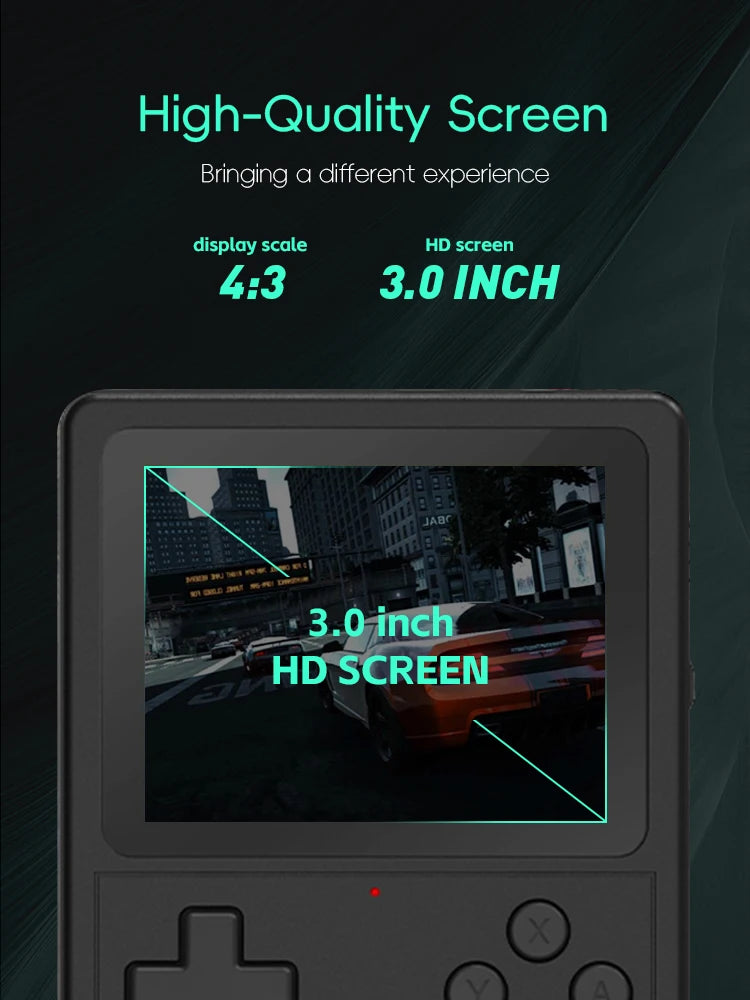 This handheld game console has more than 6000 selected classic games, 3.0 HD screen ,high-definition smooth screen with high-precision joystick, support for downloading and collecting games, support for 7 kinds of emulators, covering a wide range of games.