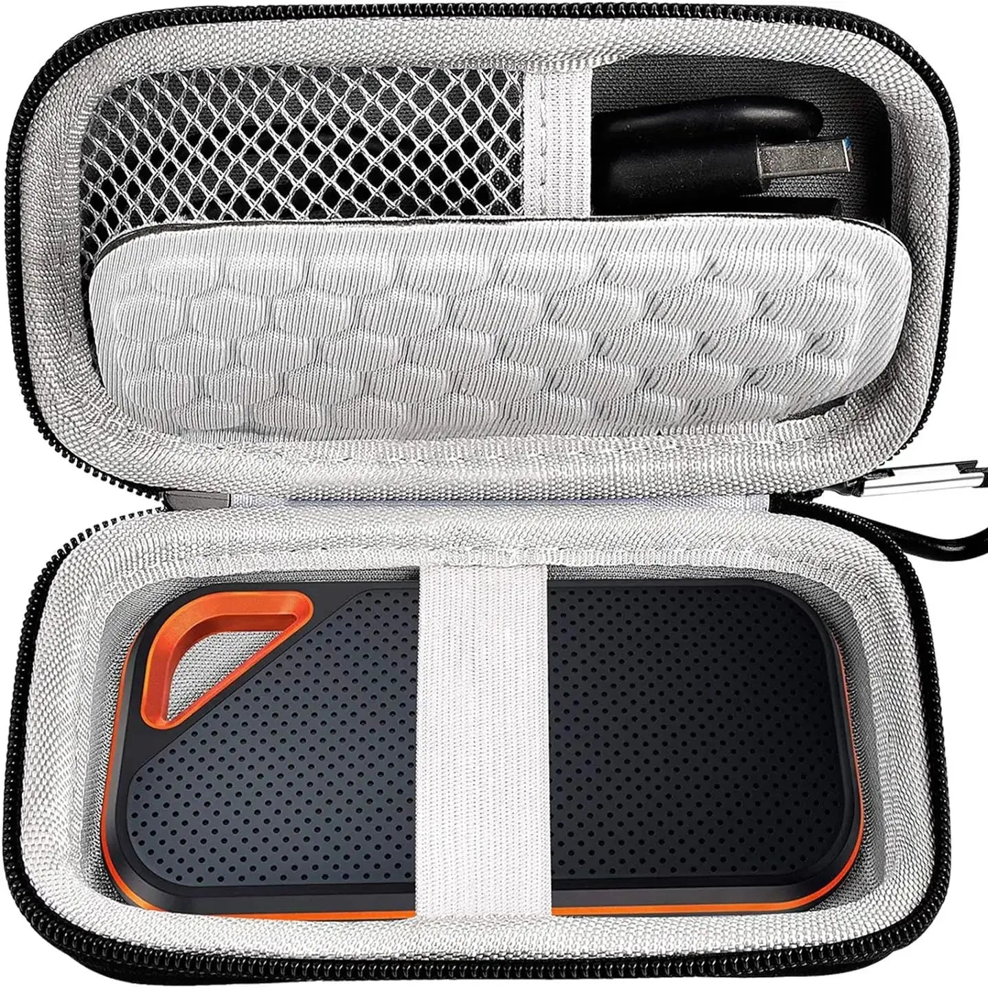 Convenient to Carry: External dimensions: 5.25*3.25*1.6 inches. External hard drive carrying case can be easily put into your backpack or pocket. External solid state drives case with the smooth 360-degree zipper for easy open and close. Flash drive case with the sturdy carabiner allows you to hang on your backpack or luggage, allowing you to experience the convenience for sandisk extreme ssd anytime and anywhere.