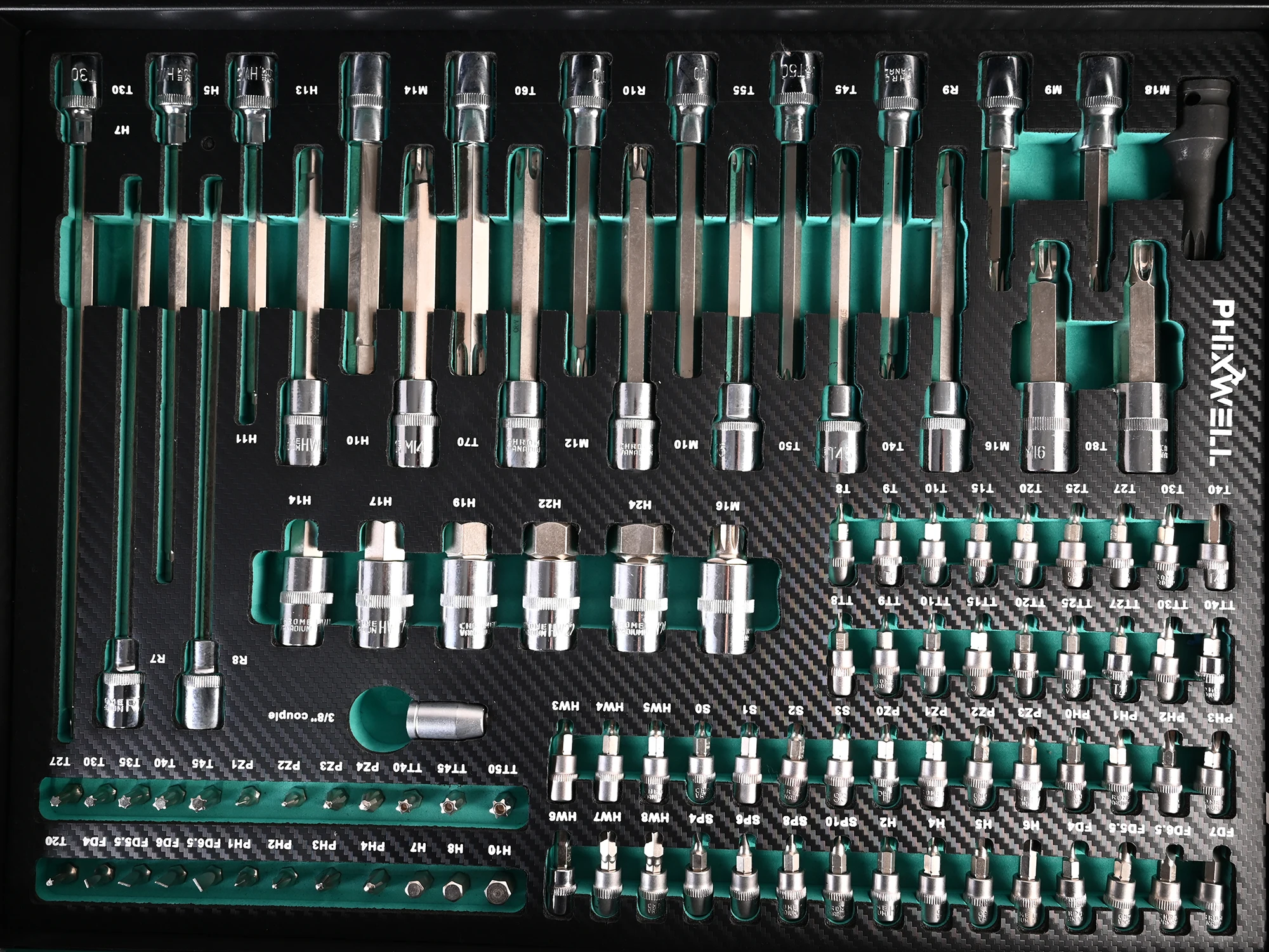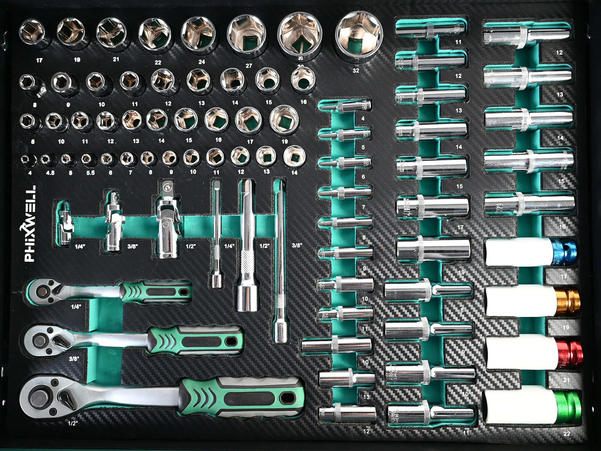 17pcs1/2DR sockets ,8-9-10-11-12-13-14-15-16-17-19-21-22-24-27-30-32mm, 10pc1/4DR deep sockets ,4-5-6-7-8-9-10-11-12-13mm,