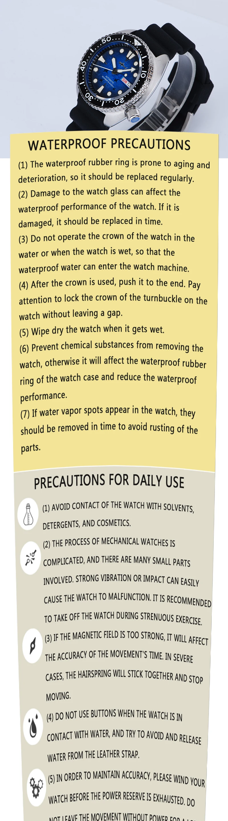 2. Don't touch the watch with any cosmetics with chemical cost, chemical and corrosive daily necessities, etc. (Because these chemical costs will corrode the electroplating color on the watch surface)