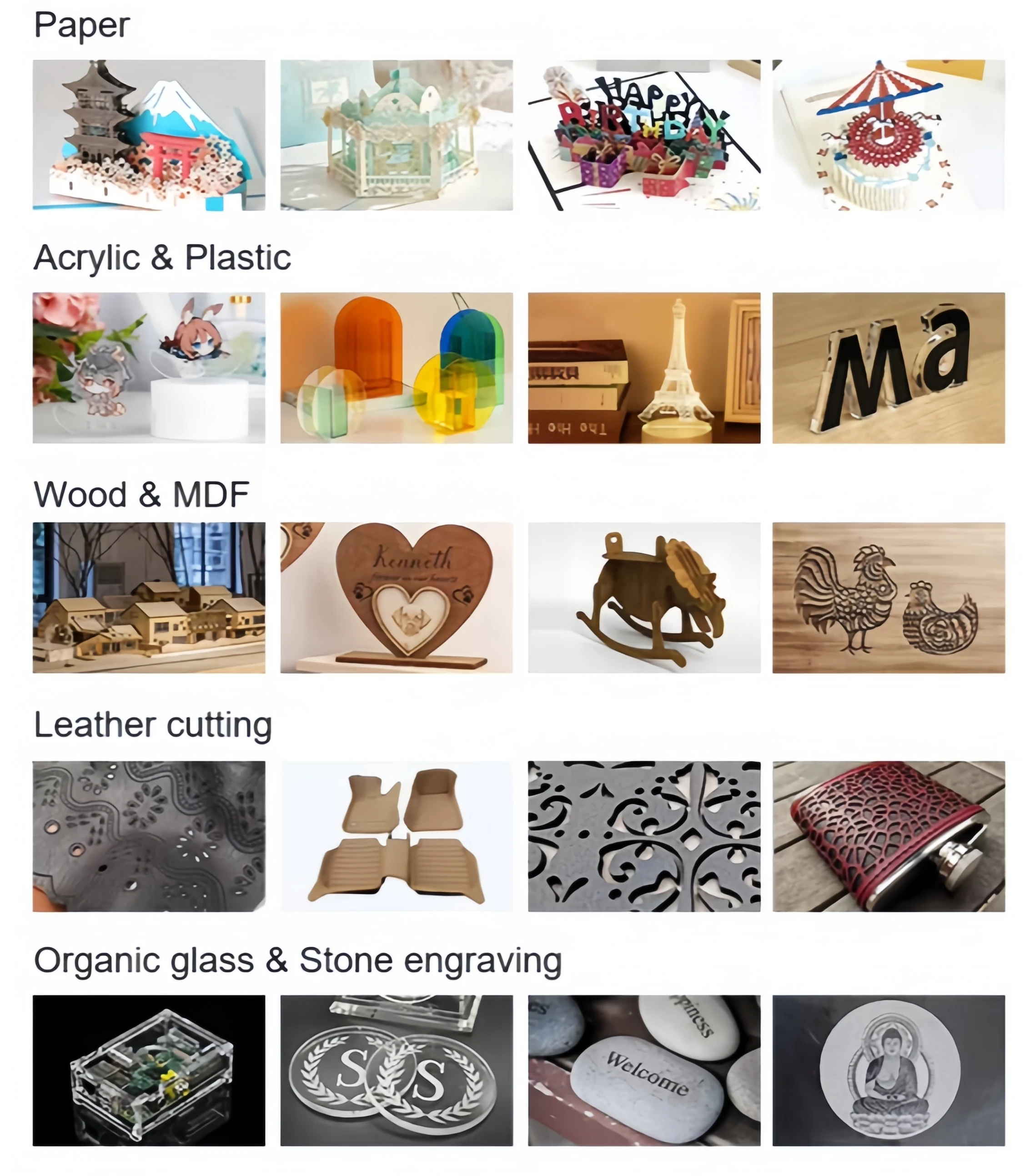 Nonmetal materials, like acrylic, wood, MDF, die board, and so on.