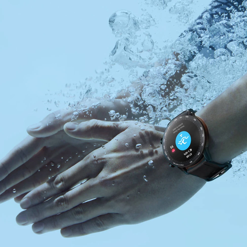 6. Water resistance rating of 50m based on the ISO standard 22810:2010, meaning that the watch works when swimming or washing hands, etc. Rinse the band with clean water and dry it promptly after swimming in seawater for prolonged use.