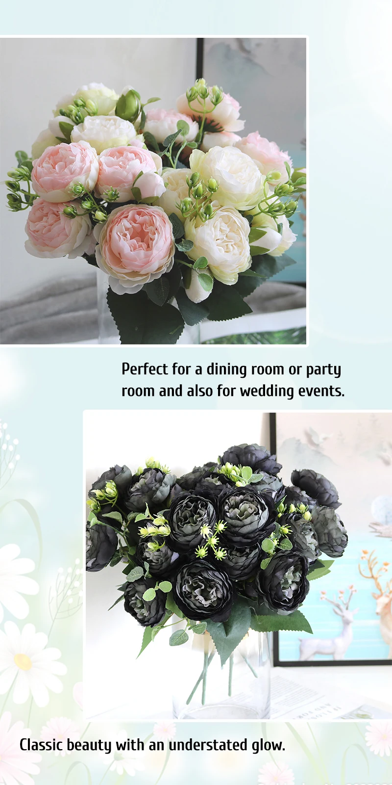 【EASY TO MAKE】Decorate these bouquets with multiple flower heads and buds, green leaves, and the elegant colors can easily become beautiful centerpieces. Realistic looks and fade-resistant colors help you achieve beautiful vibrant decorative effects.