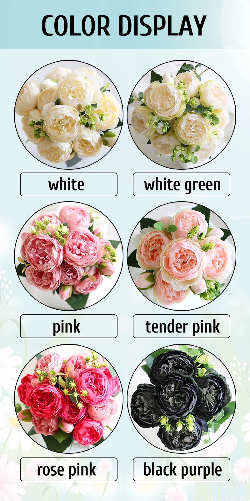 Color: white, white green, pink, tender pink, rose pink, black purple, violet, purple, yellow, red, rose red, blue