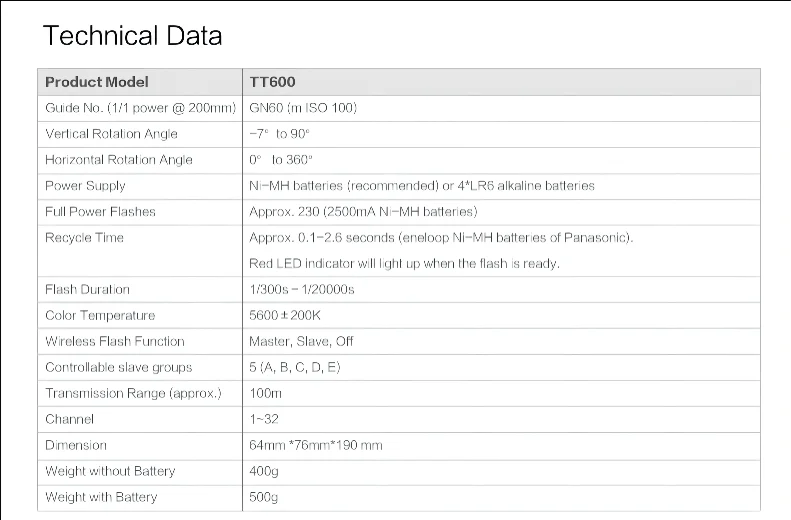 Full Power Flash Times: Approx.230 times (2500mA Ni-MH batteries used)