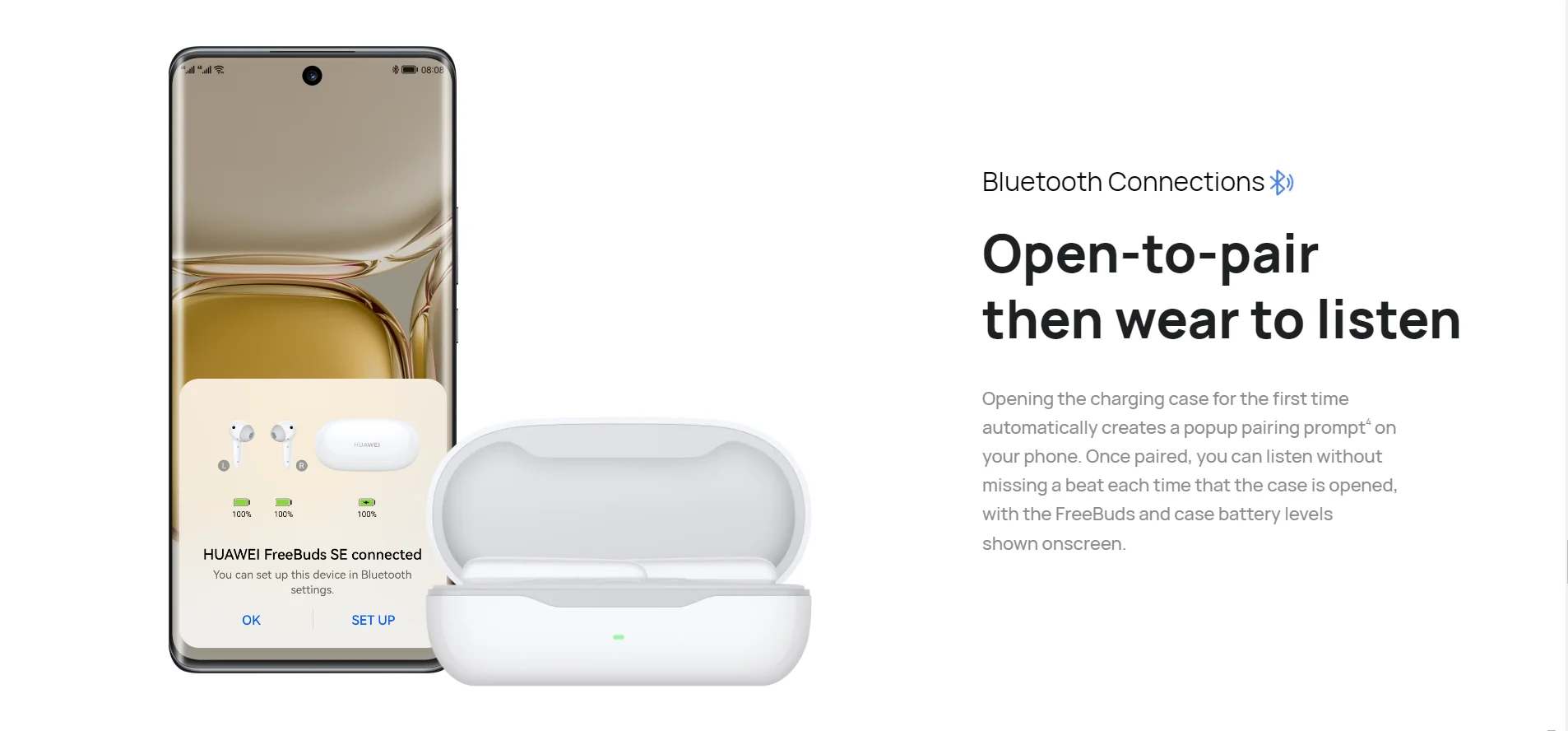 Opening the charging case for the first time automatically creates a popup pairing prompt4 on your phone. Once paired, you can listen without missing a beat each time that the case is opened, with the FreeBuds and case battery levels shown onscreen.