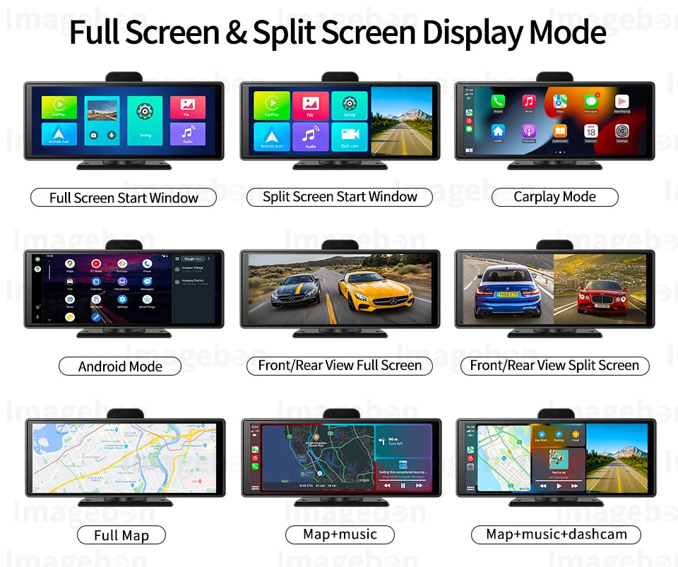 Our products support UI full screen and split screen.In carplay/Android auto mode,it supports front/rear view full screen,front/rearview split screen,full map,map+music,map+music+front/rear view dashcam,map+music+front and rear view dashcam.You can choose display mode according to your requirement.
