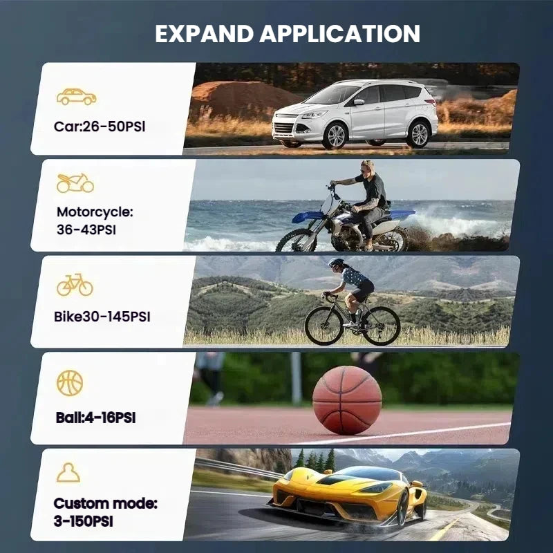 Flexibility and autonomy:This air pump for car tires offers 4 pressure unit options (PSI, KPA, BAR, and KG/CM²) and 4 preset inflation modes (bicycle, motorcycle, car, and ball), giving you the flexibility to inflate anything. Besides, the manual mode makes it easy to adjust the pressure (3-150psi) to match any inflation object. It is an ideal choice for inflating cars, motorcycles, bicycle tires.