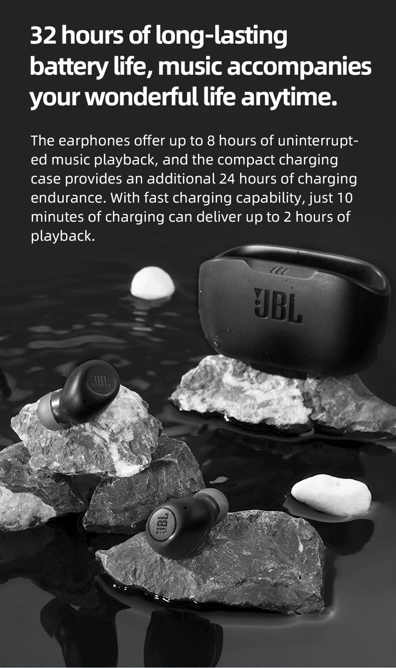 The JBL Wave Buds have their own 8-hour battery life, plus the 24-hour battery life of the charging case, for an all-day audio experience. When you need more power, it takes just 10 minutes to quickly recharge for two hours.